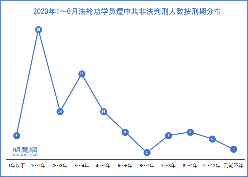 ![]() 图1:2020年1~6月法轮功学员遭中共非法判刑人数按刑期分布 |