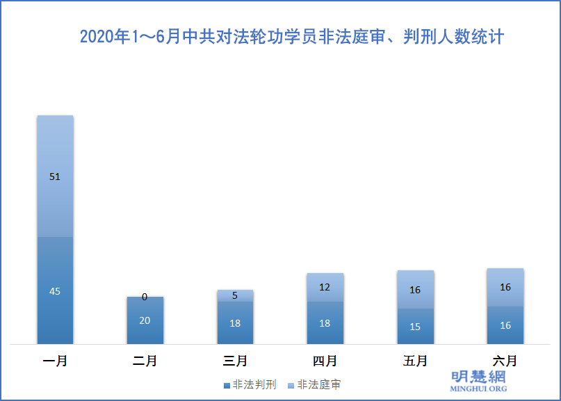 据明慧网信息统计,二零二零年一至六月中共非法判刑人数为132人。其中,一月份判刑45人,二月份判刑20人,三月份判刑18人,四月份判刑18人,五月份判刑15人,六月份判刑16人。