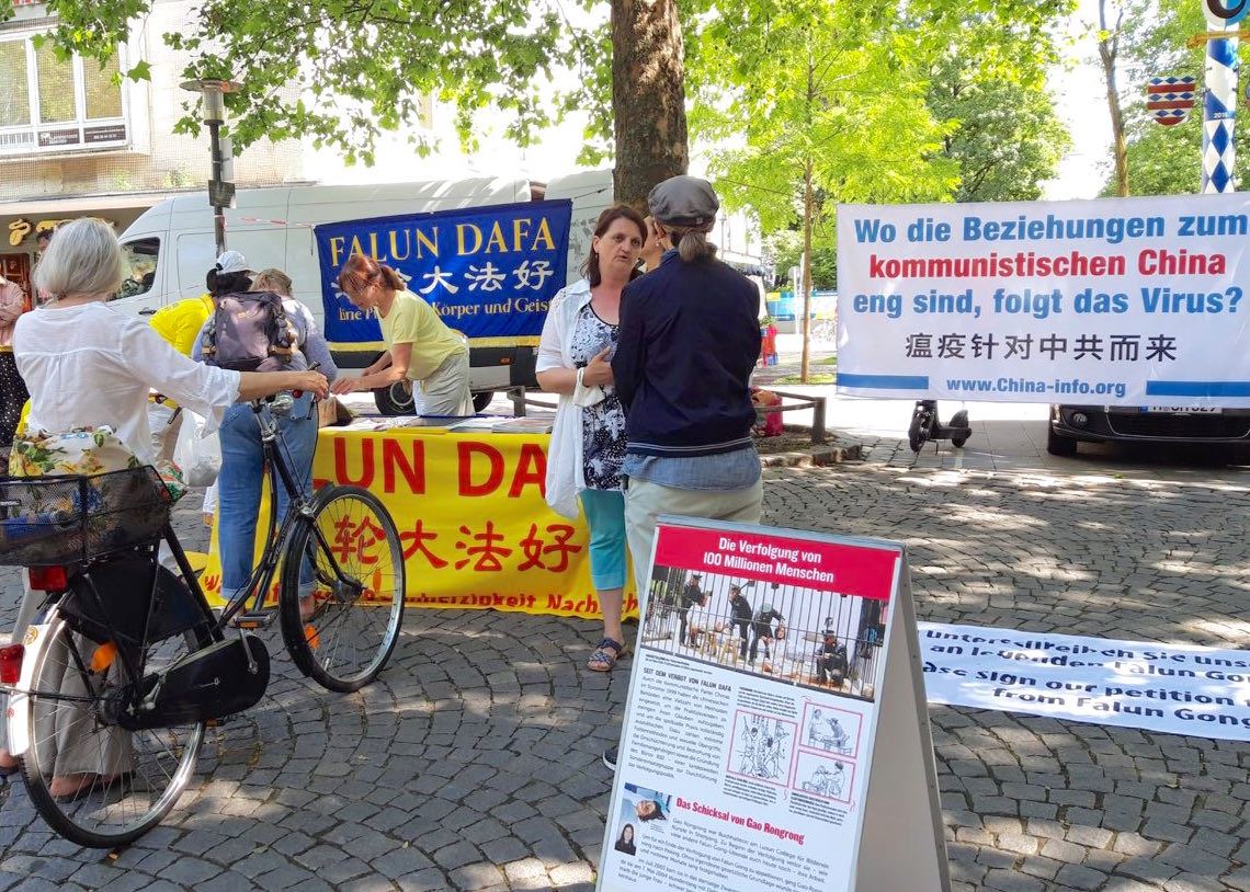 二零二零年七月四日,在德国慕尼黑红十字广场(Rotkreuzplatz)上,法轮功学员们在这里举办了真相信息日活动。庄森女士告诉法轮功学员,“这正是人的能耐,通过修行找回自我,与更高层的力量紧密相连,这是多么强大的力量啊。”她认为法轮功给被新冠(中共)病毒蒙尘的乱世带来了希望。