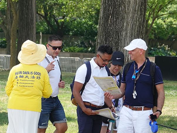 ![]() 图7:前来国家广场的美国民众跟法轮功学员攀谈,了解真相。 |
