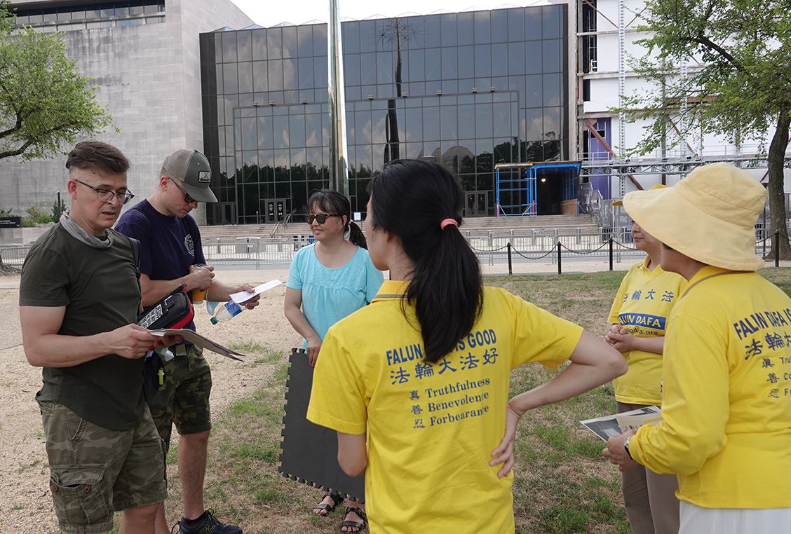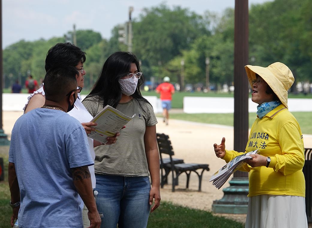 华盛顿特区一些居民和他们的家人早早来到国家广场,等待在现场观看当晚的烟花和飞行表演,一些人阅读着法轮功学员递过的法轮功真相传单和中共病毒疫情真相特刊,一位男士主动帮法轮功学员打横幅。