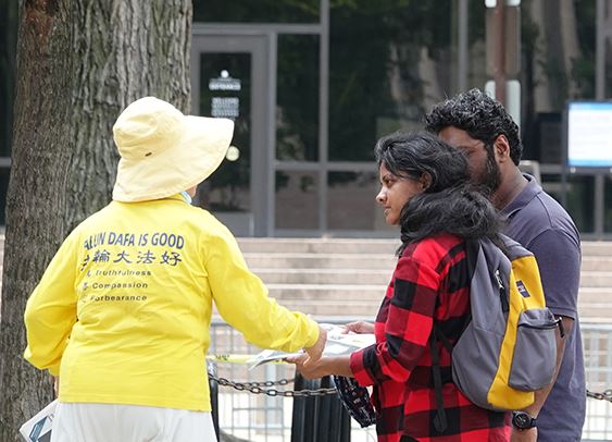 当得知眼前这位善良的七十五岁女士(王春荣)因为坚持“真善忍”信仰,被中共非法关押三年半,他们感到震惊。王春荣女士给他们讲述了自己及两个妹妹因为坚持修炼法轮大法遭受中共迫害的经历和中共活摘法轮功学员器官的罪恶。他们接过真相资料,表示回去后好好看看,并把自己的联络信息留给法轮功学员。