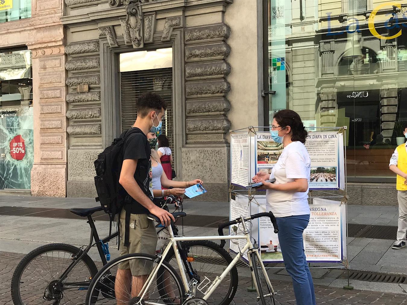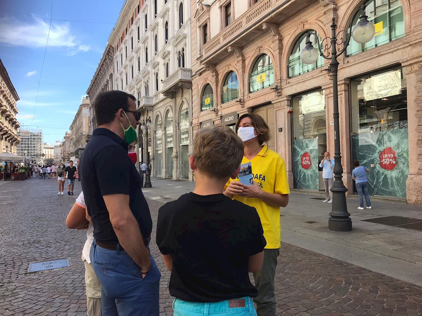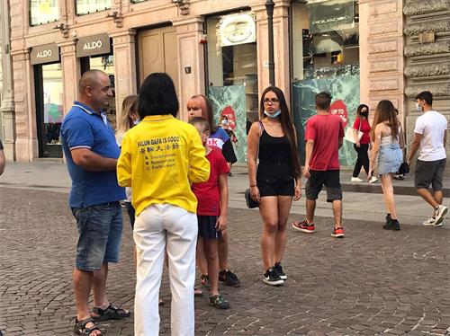 一位意大利父亲带着两个孩子与学员交谈了很久。学员先跟他们讲述了自己修炼法轮功后受益的经历。父亲问道:“为什么法轮功学员要舍弃自己的休息时间在这里举行活动?”学员告诉他们,因为中共对内封锁网络,对外谎言宣传欺骗全世界,使得人们无法知道真实的信息,接着告诉他们中共活摘法轮功学员器官的罪行,而迫害已经持续了二十多年。父亲和两个孩子都露出不可置信的表情。父亲表示完全明白了,并衷心支持法轮功学员反迫害。