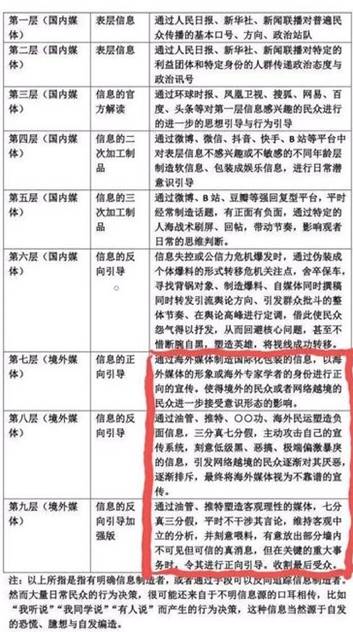就在2月29日中共网警对社交媒体开始封号的同一天,海外推特上传出一些帖子,揭露中共如何舆论引导的九层结构。这是一个复杂的宣传策略,被网民称为“九层妖塔”。中共通过各种媒体,官方的、民间的、海外收购的、安插的、渗透的等不同媒体,利用正面的、反面的、表层的、深入的、潜移默化的、或疾风暴雨等各种方式,有的新闻是三分假七分真、有的是七分假三分真,中共利用各种手法,让人不知不觉中,被中共舆论牵着鼻子走。