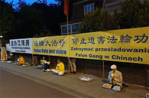 七月二十五日晚间二十一点,波兰法轮功学员在波兰北部港口城市格但斯克中领馆前烛光守夜,悼念被中共迫害致死的法轮功学员。