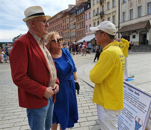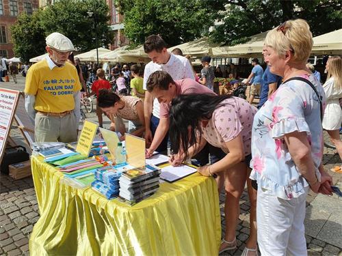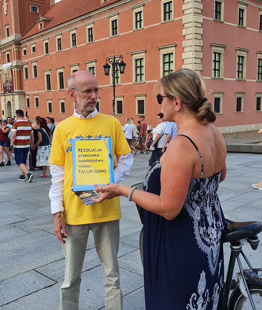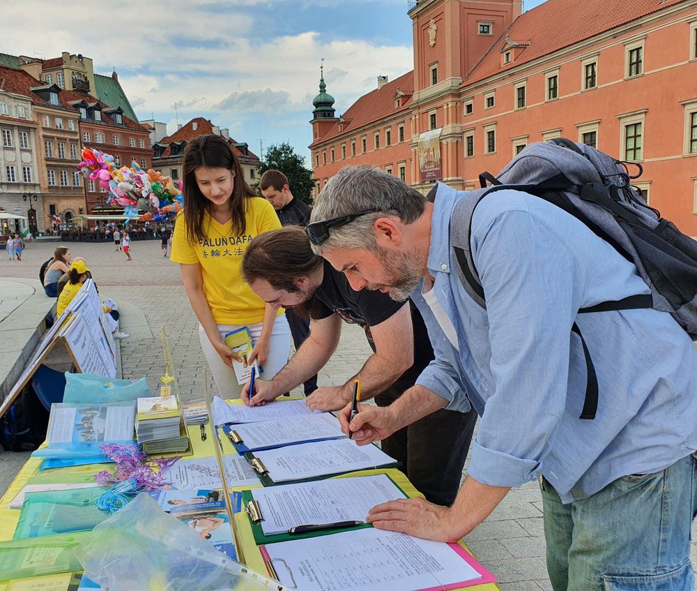 七月十九日,波兰法轮功学员在华沙古城举办讲真相活动,学员们派发传单,展示功法,征集反迫害签名。明白法轮功真相的民众,纷纷签名表示支持法轮功学员反迫害。