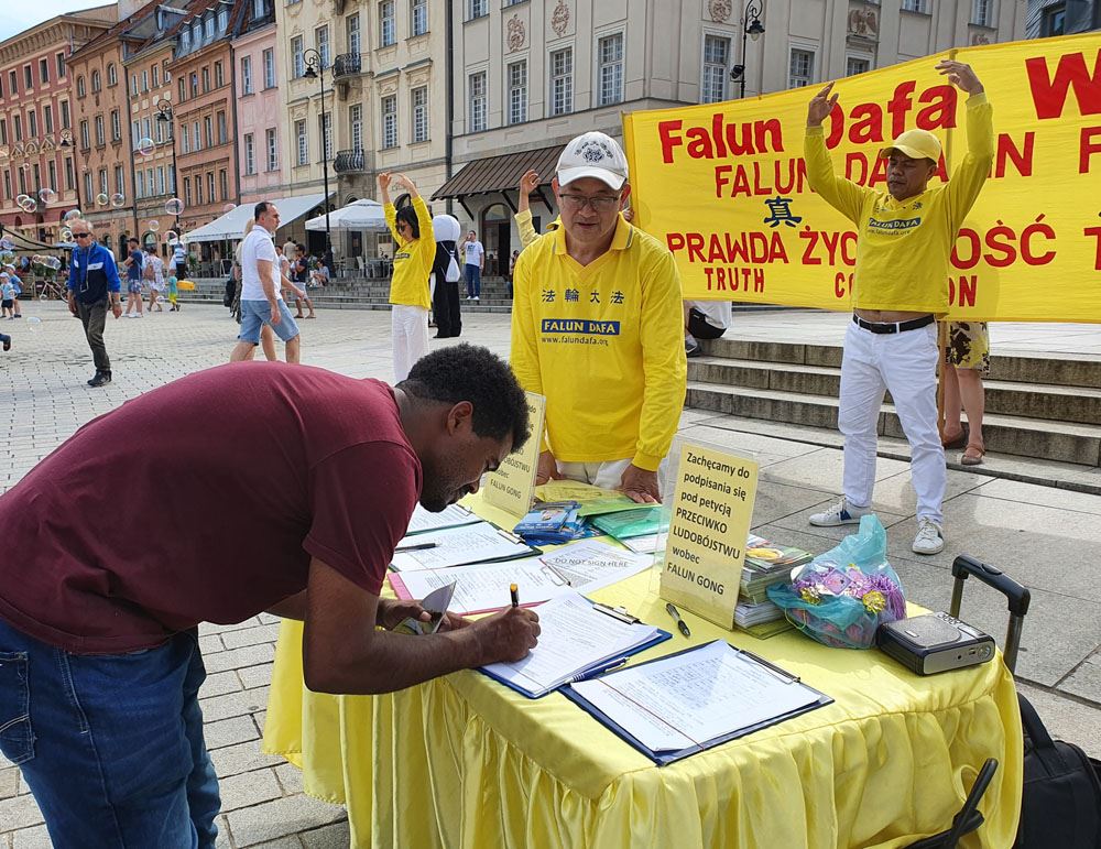 来自埃塞俄比亚的ABRHA先生,是一位居住在德国汉堡的哲学博士,他非常喜欢古老的中华传统文化,熟知孔子著作,向往中国的长江黄河,这次到波兰来旅游,第一次知道了法轮功,第一次听到法轮大法这个名称,并引起他极大的兴趣。他说:“我一定要拜读《转法轮》。”“能让中共倾国力镇压不了的一个和平团体,一定有着伟大的精神力量,有着无法战胜的内涵,我非常想了解这到底是什么。”面对修炼真善忍的法轮功学员在中国大陆被残酷迫害,被强行活摘器官的真相,ABRHA先生感到十分震惊,他说:“我签名支持你们。”ABRHA先生在参观华沙古城后,又来到法轮功活动现场,长时间的坐在旁边观看,倾听《普度》、《济世》音乐。