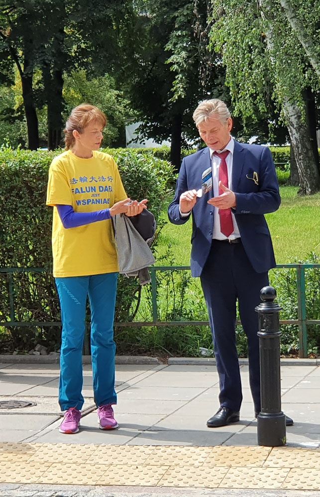 波兰议员、原国防部长Macierewicz Antoni先生仔细观看了法轮功真相展板后,告诉学员:“我知道法轮功受迫害这件事,我声援你们的活动。”他告诉法轮功学员,他知道有30国600政要联署签名要求制止迫害,要求惩办恶首,他也非常希望签名支持法轮功,他愿意呼吁更多的议员都来参与这个活动。第二天Macierewicz Antoni先生就向法轮功学员发来签名,希望法轮功学员代为转交声明与表达自己反对中共迫害法轮功的心声。