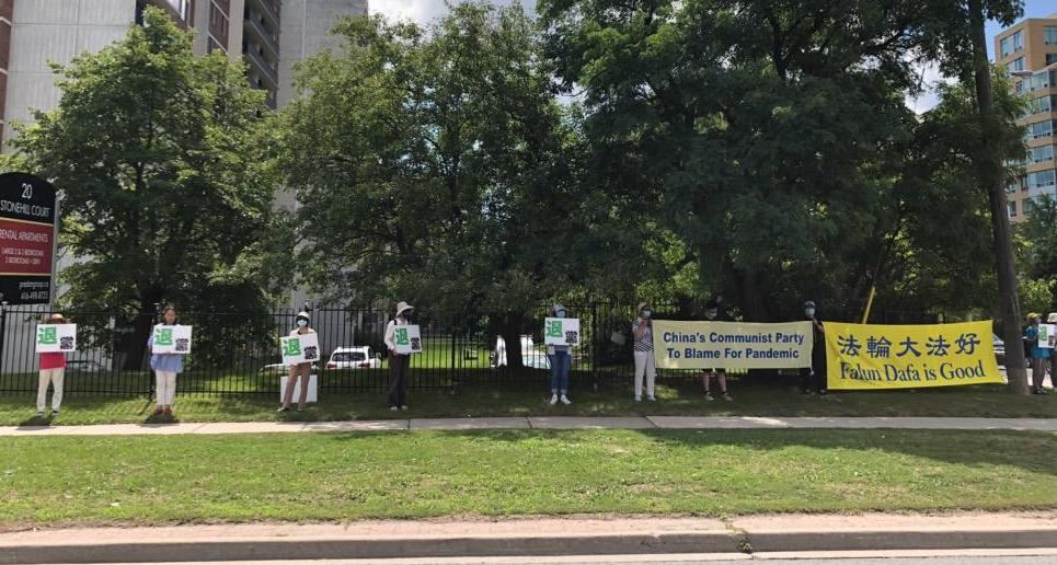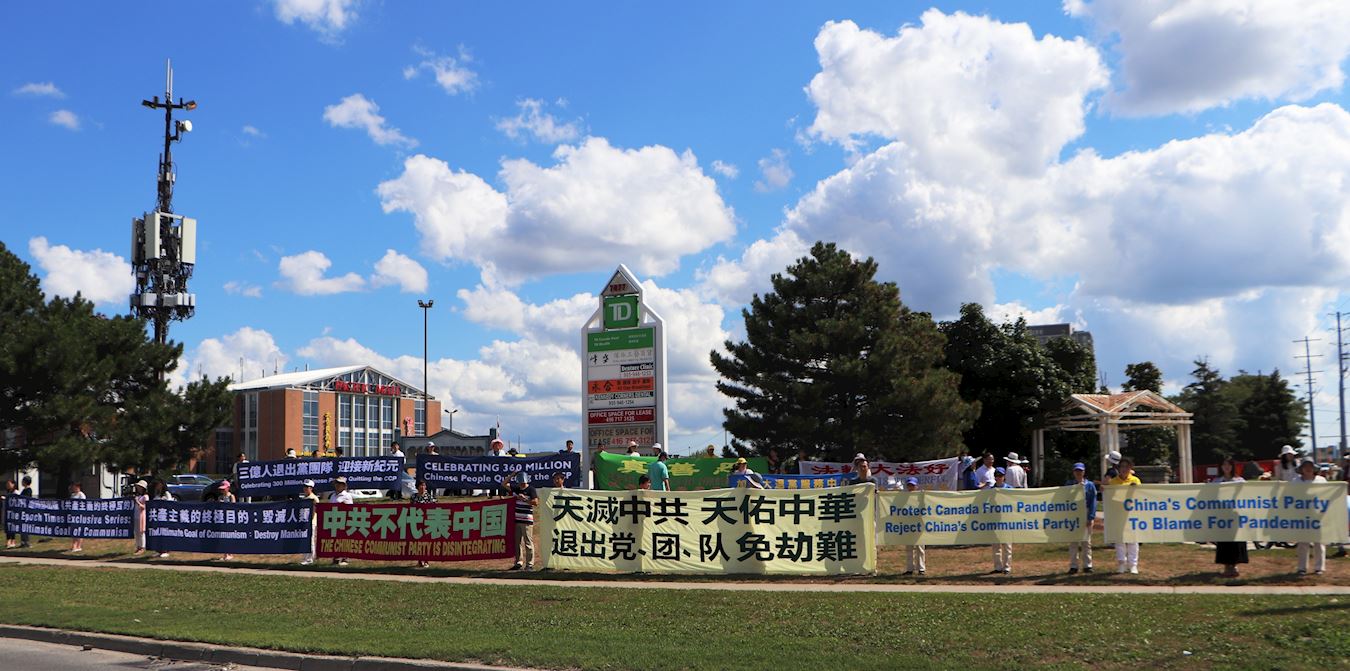 :退.大潮的集会和汽车游行。'>图1~3:二零二零年八月八日上午,多伦多法轮功学员和民众在大多伦多地区的万锦市的太古广场前,举行了声援三:退.大潮的集会和汽车游行。 |