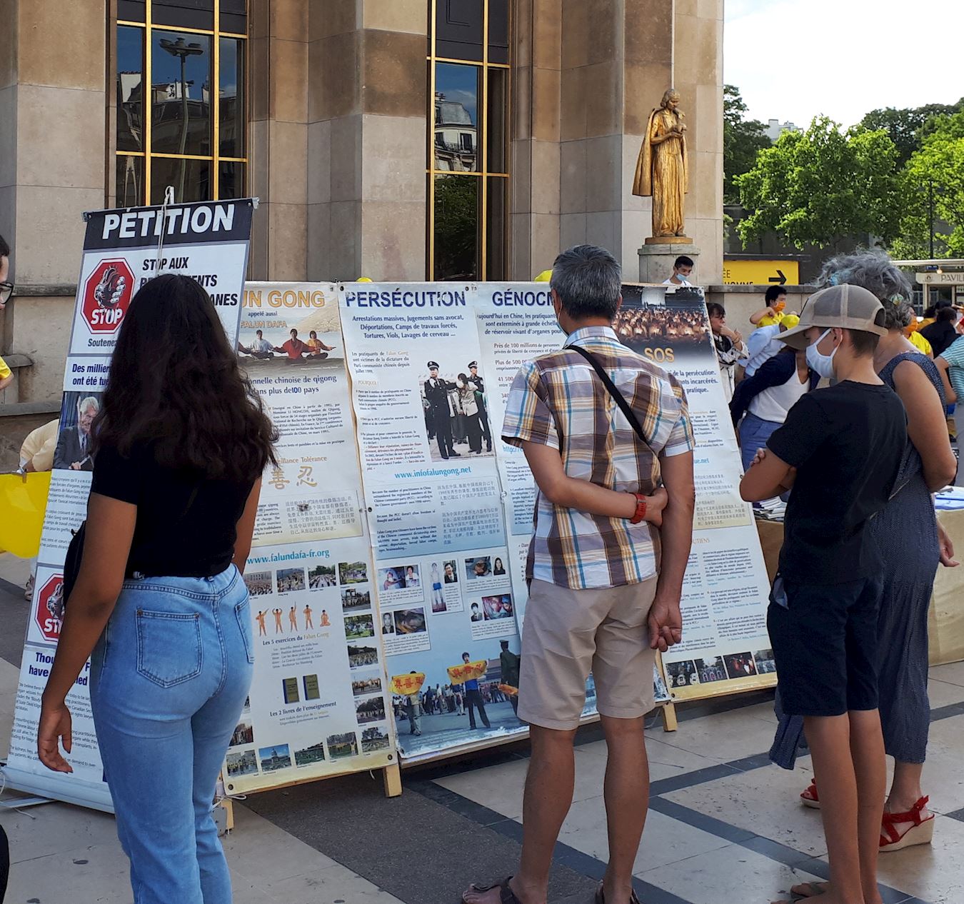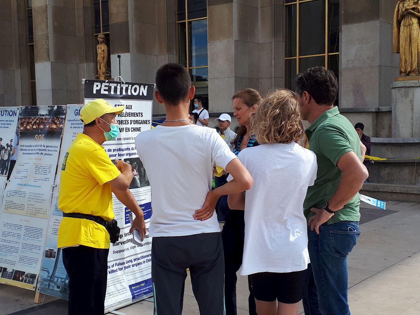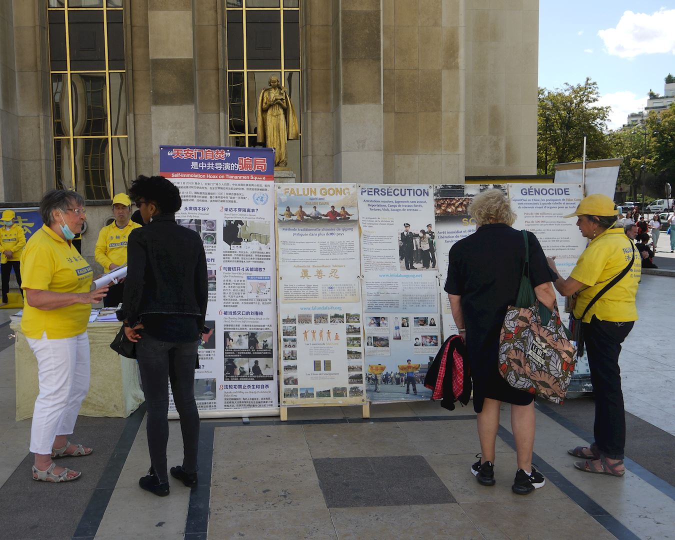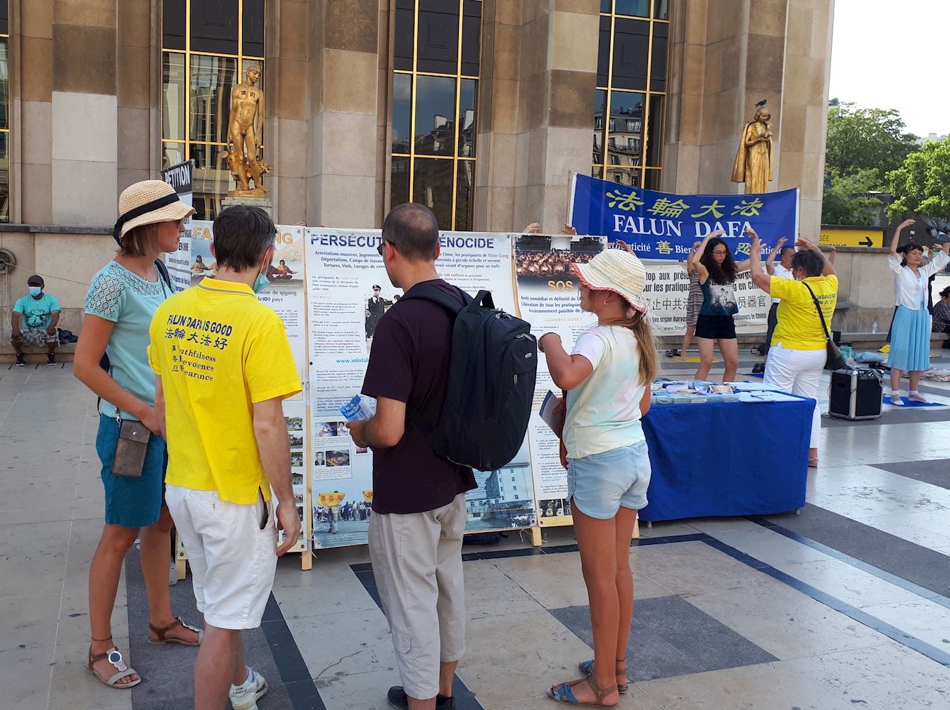 ![]() 图1~3:法轮功学员在巴黎人权广场进行炼功、讲真相和征集签名反迫害活动 |