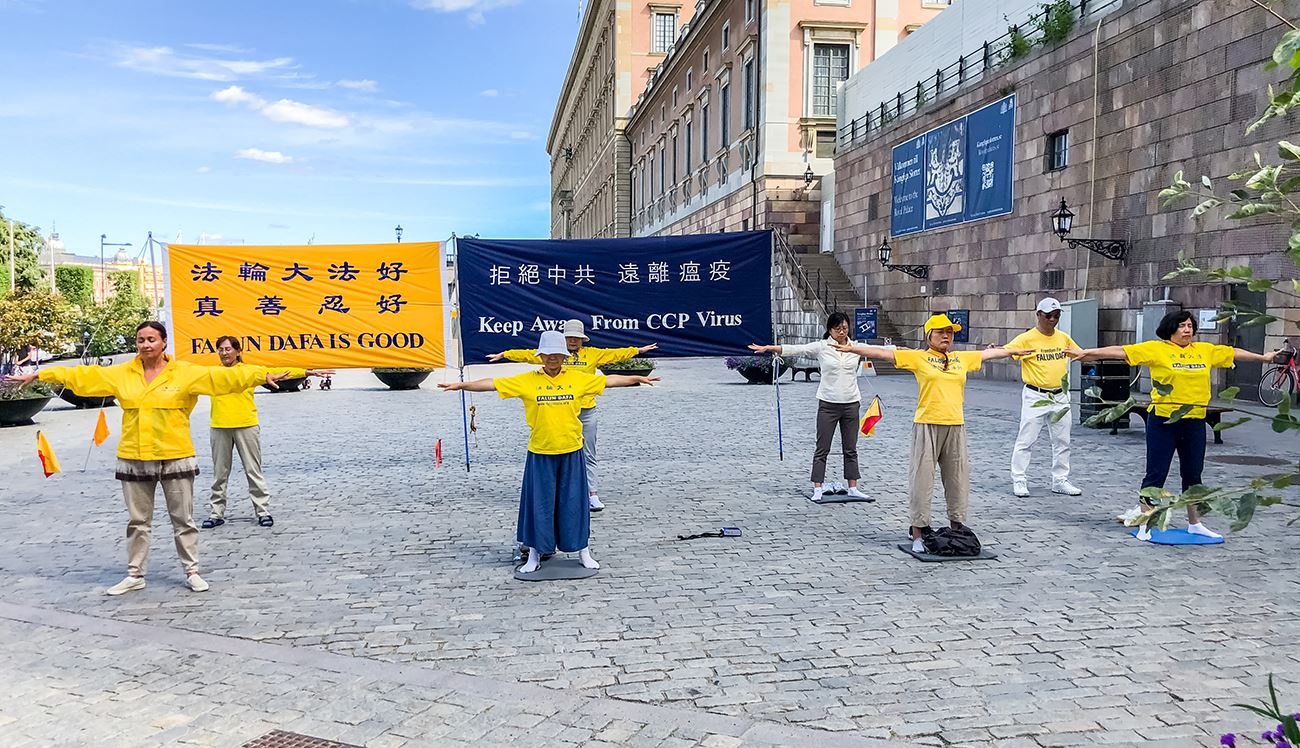 ![]() 图1:法轮功学员在斯德哥尔摩市中心国会大厦旁的钱币广场,举办讲真相活动。学员在 展示功法。 |