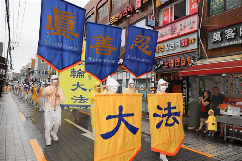 游行队伍行进中,有两位韩国人在家里听到了天国乐团演奏的鼓声,特意出来观看,并高兴地收下法轮功学员赠送的莲花护身符。一名观看活动但不太了解三:退.的韩国市民在听学员讲述迫害真相后表示,理解了法轮功学员为什么要在韩国开展反迫害的活动,“韩国是民主国家,我们反对共产党。”