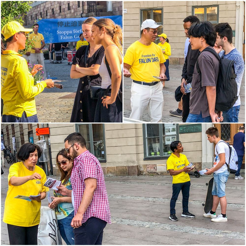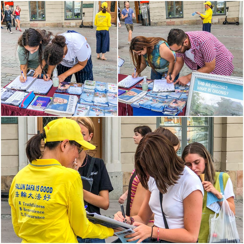 当他们听到法轮功这么好的功法遭到中共残酷迫害的真相时,很是气愤。俩人都表示:“这实在是太悲惨了!一定要制止!”签完了字,他们就详细地打听了斯德哥尔摩当地每周日在市中心附近公园那个炼功点的具体时间和地点。这时,亚历山德拉很兴奋。她大声地说:“好!周日炼功点见吧!我们一定要学法轮功。”她还笑着说:“现在我好像明白了,今天为什么要在这儿跟你聊了这么久,我来你们这儿的意义是什么了。”