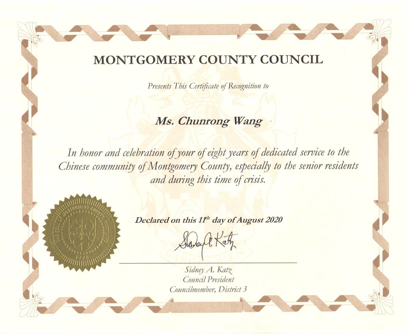 ![]() 图1~2:马里兰州蒙哥马利郡议会主席西德尼·卡兹(Sidney Katz)为王春荣签发褒奖,感谢她为华人社区做出的贡献。 |