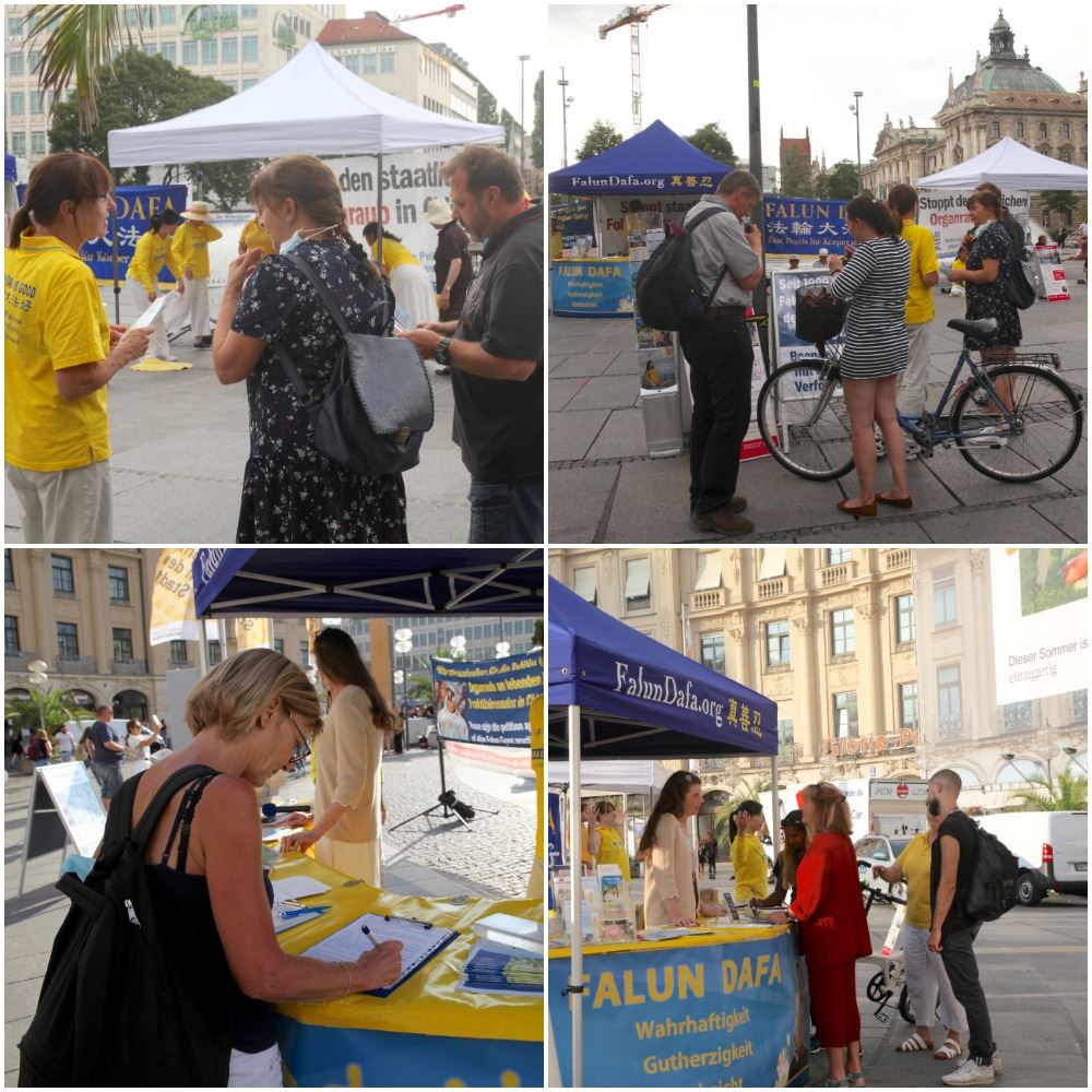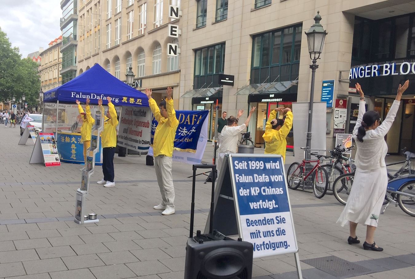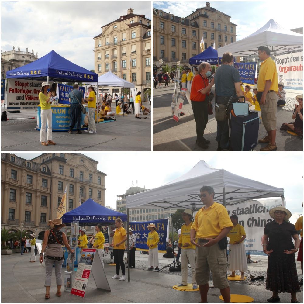 法轮功学员于周二、周四和周六分别在奥迪安广场(Odeonsplatz)、步行街森德林根尔(Sendlinger Straße)和卡尔斯广场(Karlsplatz)举办活动。法轮功学员摆出展板,打出横幅,向民众展示功法,同时用德语向民众进行详细介绍。