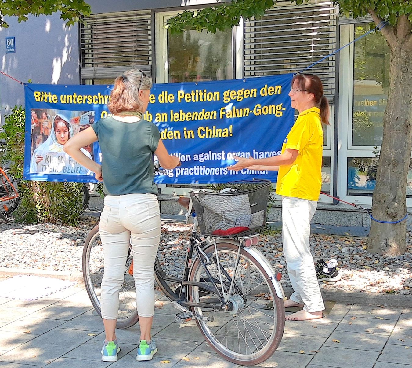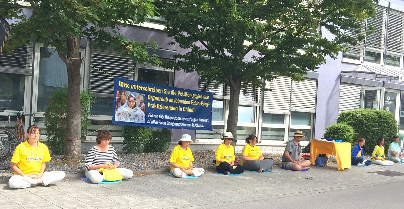 周一、周三和周五,法轮功学员在慕尼黑中领馆前举办抗议活动。大型横幅揭露了中共对法轮功学员的迫害。来往的公交车上的乘客,几乎都朝学员的方向看过去。一些开车经过的人还朝着法轮功学员竖起大拇指。不少路人签名后,祝法轮功学员成功。