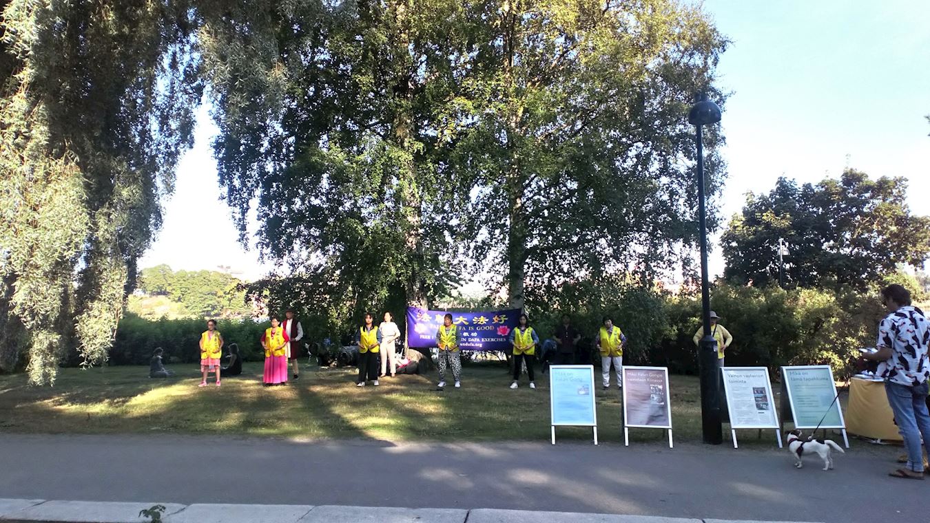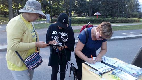 一位穿着运动服的女士正在跑步,看见学员们炼功的场景就停下来了。她问:“你们在干什么?”学员告诉她发生在中国的迫害真相以后,她还是不大理解的继续询问详情:“什么是法轮功?在哪里发生的事情?为什么要发生迫害?”当她理解整个事情的来龙去脉以后,她表示要签名反迫害,她对学员说:“你们要加油!”