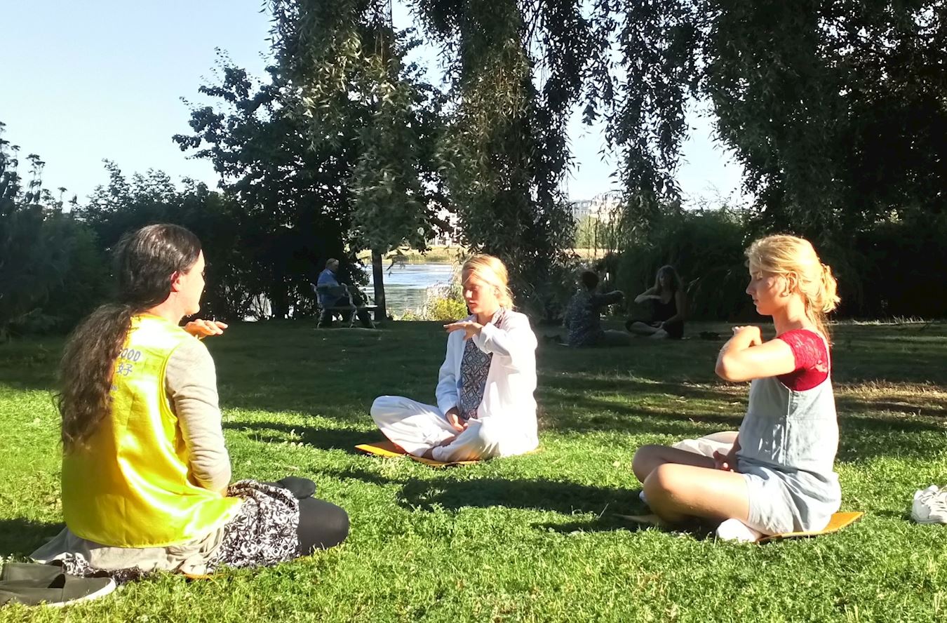 一位女士看到学员们在社交媒体上发出的信息后,背着自己的座垫前来学功。她告诉说:十年前,我在某一场合跟着学炼了法轮功功法。看到你们的信息后,就想过来再学一下。学完以后,她说:“功法让我心情非常舒畅,感受到很强的能量”。