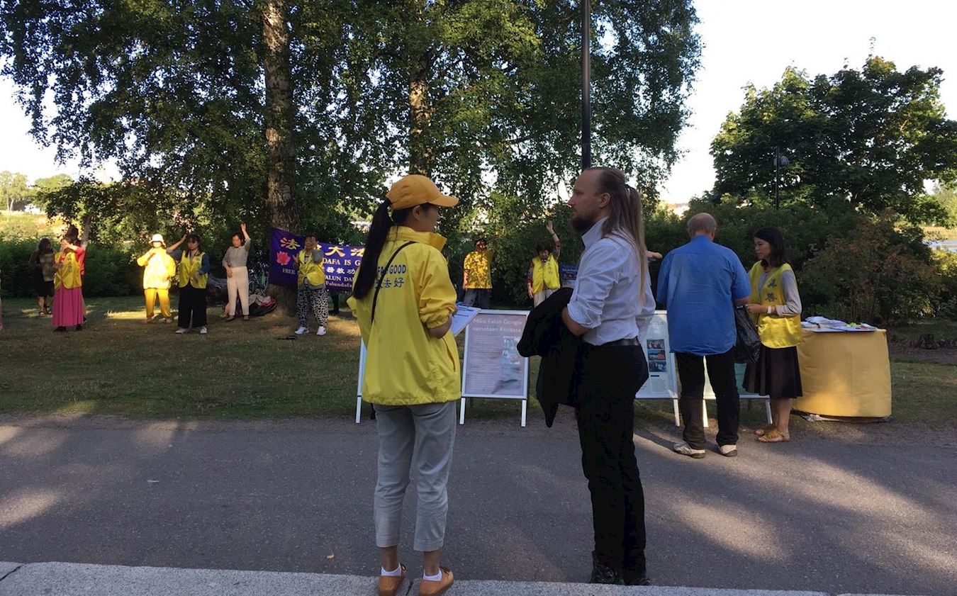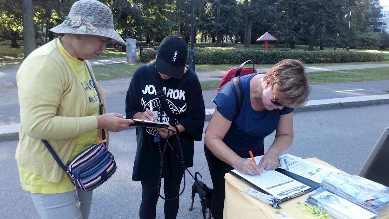 从事秘书工作的欧蒂(Outi)和朋友一起出来散步,她们之前没有听说过法轮功。了解中共对法轮功学员的迫害真相以后,她们非常震惊当今世界上居然还会发生这么残酷的活摘器官的事情。她对学员说:“我们要给你力量。你们要加油!”