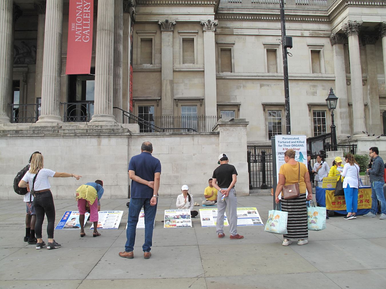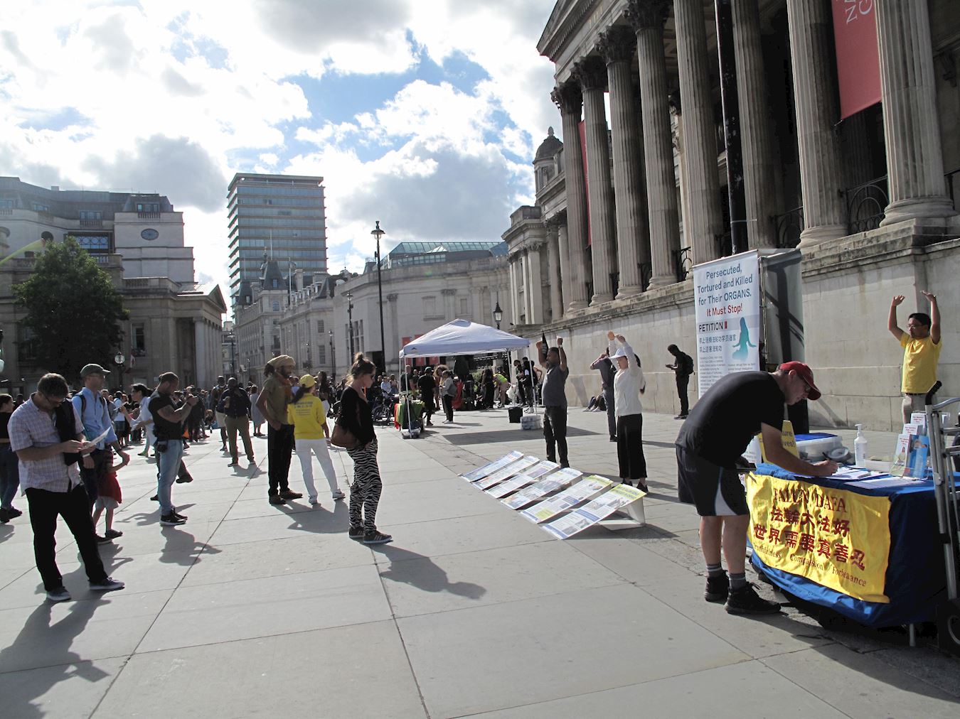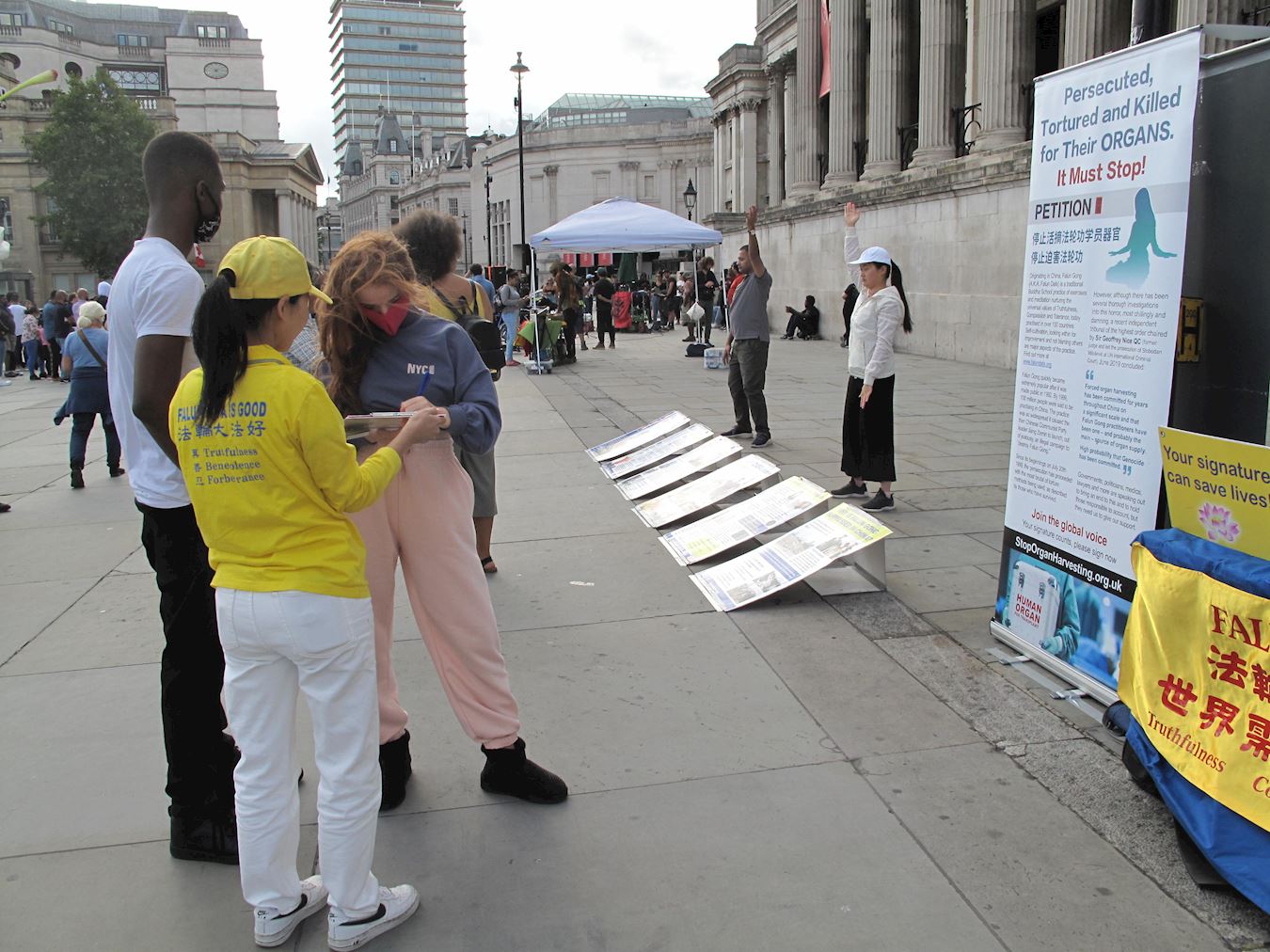 法轮功学员上一次在特拉法加广场传真相是在三月七日。中共病毒的大流行危害拖累着世界,而在面临劫难的人类社会,五个半月的时间却是飞纵即逝。英国政府仍在不断调整并实施针对中共病毒疫情的禁足令,鉴于特拉法加广场上重现民众自由举办的各类活动,而且过往人流量有明显回升,英国法轮功学员决定恢复在这里举行讲真相活动,以帮助更多世人抓紧时机了解法轮大法的美好,认清邪恶共产主义是恶魔,呼吁国际社会携手制止邪恶中共对法轮功的迫害、对国际社会公义的威胁。