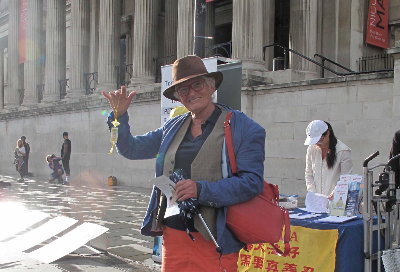 伦敦女士乔(Joe)练过太极,尝试过气功,八月二十二日在特拉法加广场了解真相并现场感受法轮功的平和能量后,立即向法轮功学员询问伦敦当地炼功点,表示要马上去学。
