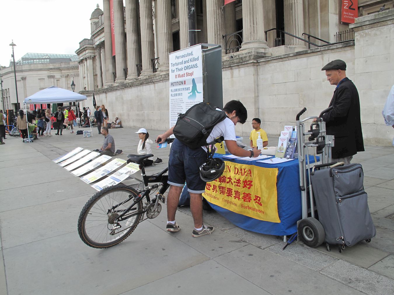 在伦敦学音乐的大学生迪耶戈(Diego)骑车路过特拉法加广场时被法轮功学员讲真相活动所吸引,停下来认真观看功法展示和真相信息,并签名支持制止迫害。