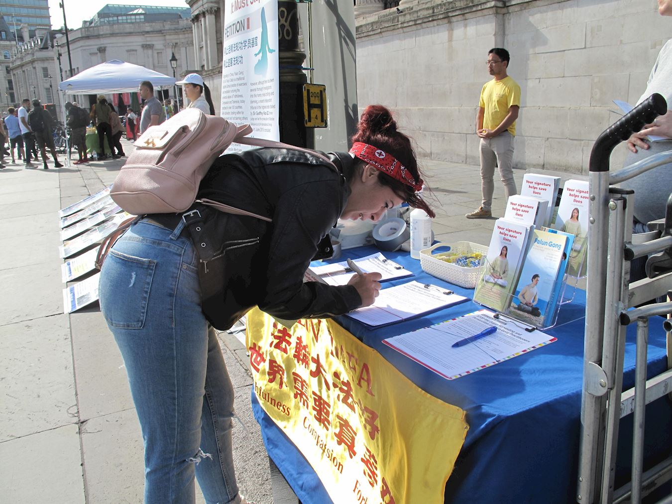 ![]() 图5:二零二零年八月二十二日,伦敦女士乔(Joe)在特拉法加广场签名支持法轮功反迫害,她希望马上学炼法轮功。 |