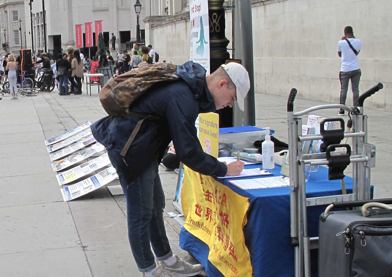 ![]() 图8:二零二零年八月二十二日,在特拉法加广场,第一次看到法轮功真相的两位伦敦学生斯卡特(Scalett,正在签名的女青年)和万德瑞(Vandre,正定睛观看法轮功学员炼功男青年)签名制止迫害。 |