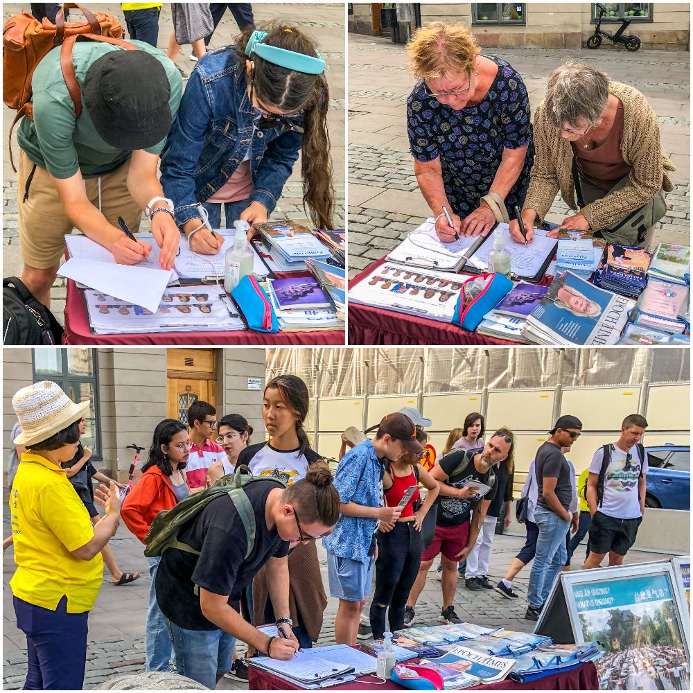 周五活动这天,一群来自斯德哥尔摩的初中生毕业生,分四、五批的经过活动场地时,都睁大了眼睛静静地站在那里仔细阅读真相展板、有的在观看学员静静地打坐炼功、有时围着学员听真相。他们都是第一次听说法轮功,了解了真相后,这些十五、六岁的孩子们都排起了队签名,支持法轮功学员反迫害。其中的一位叫阿米拉(Amira)的女孩高兴地告诉学员:“今天是学校组织的社会调查日。我觉得今天收获很大、在这里遇到了你们,让我们知道了什么是法轮功以及在中国发生的迫害,还在这里签字制止中共迫害好人,过得非常的有意义!”他们每人都拿了真相资料、还拍了很多照片,表示回去后会把真相告诉更多的人。