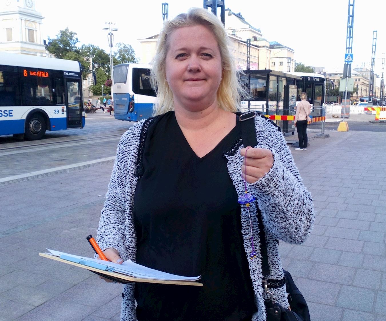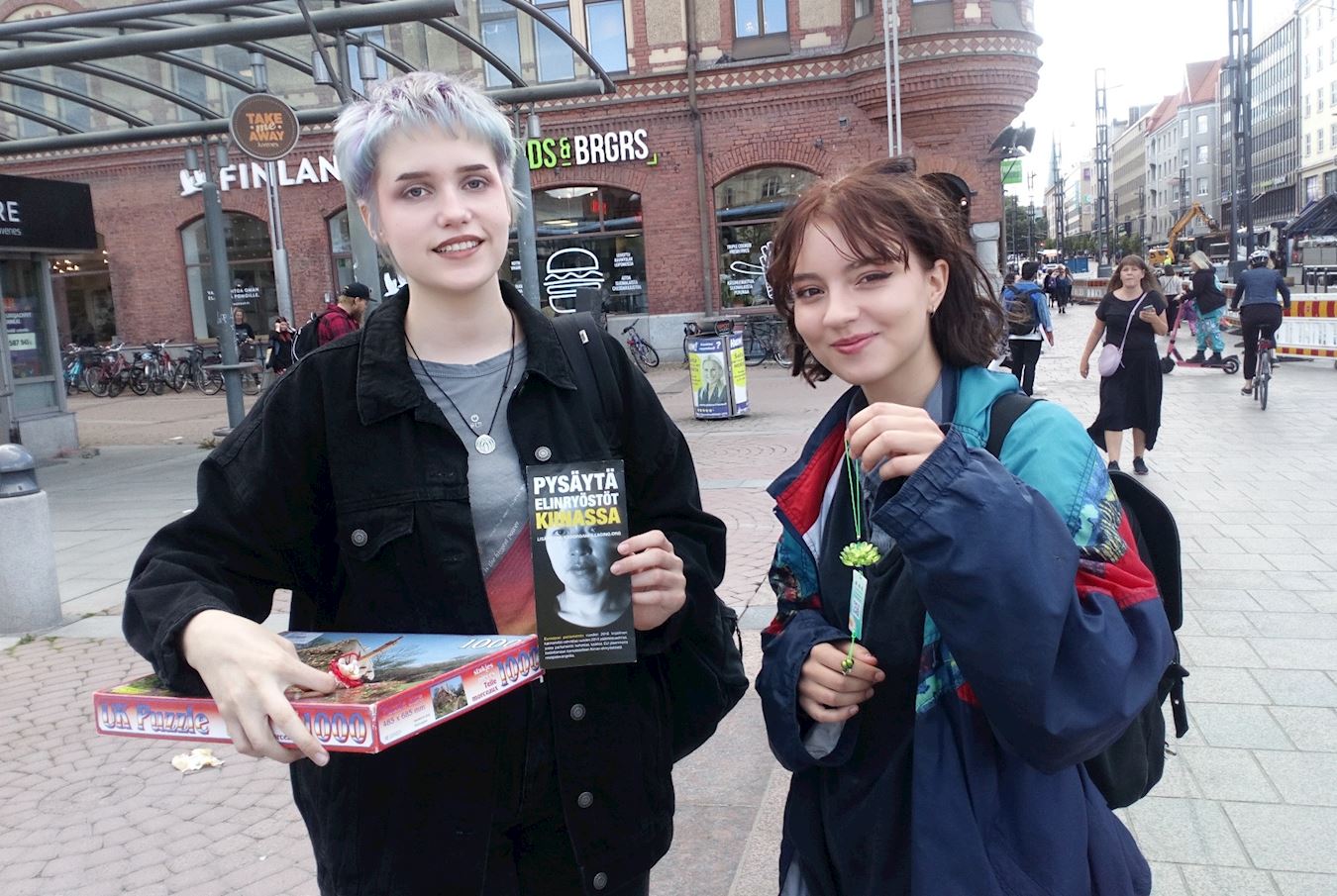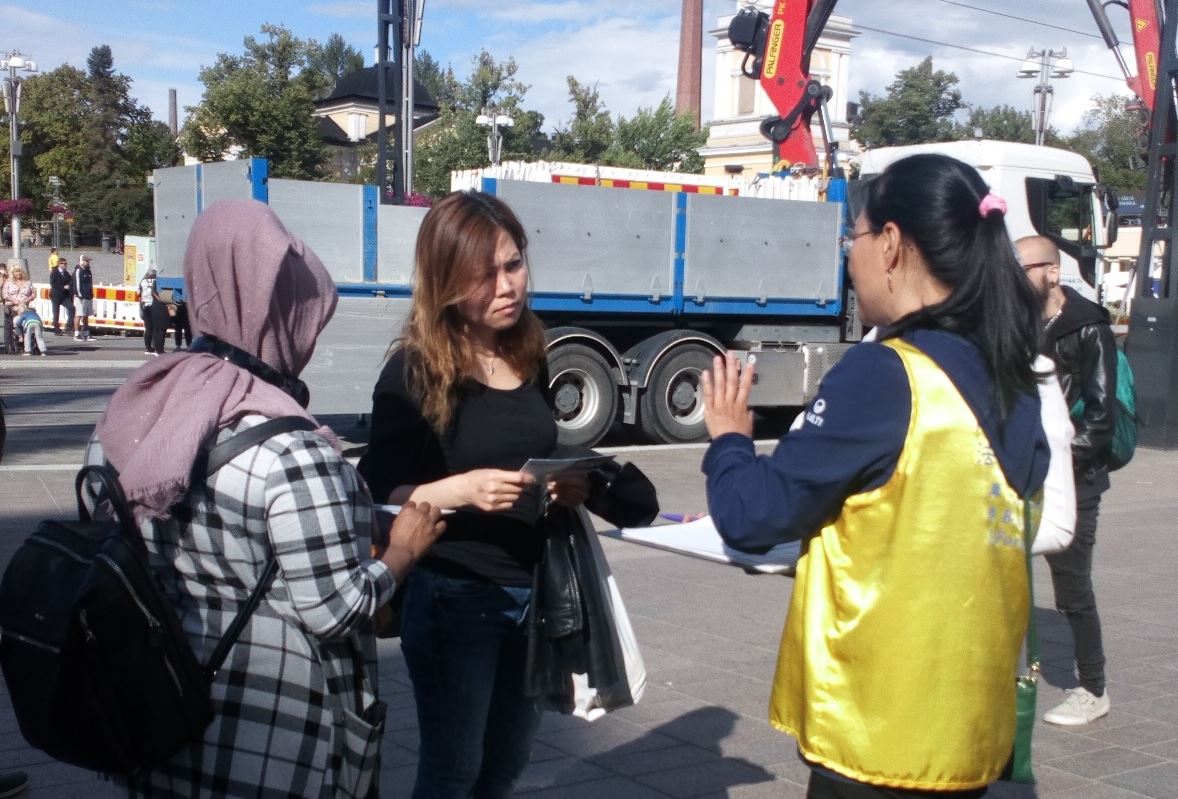 欧娜(Oona)同她的先生和孩子一起出来逛街,路过真相点。欧娜接过传单后兴奋地告诉学员说:“我先生的弟弟托尼(Toni)跟我们聊过你们的事情。托尼是一位很博学的人,他讲述了很多中国糟糕的现状。”她还说:“非常感谢你们在这里搞活动,我感受到很强的能量。”