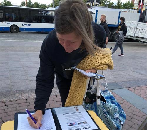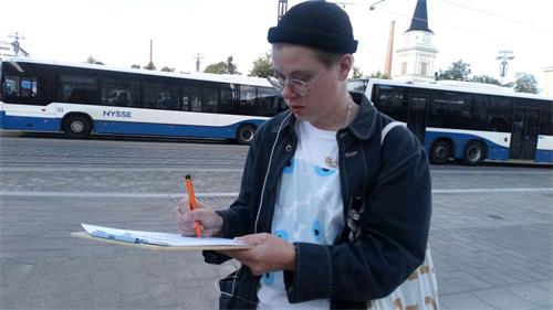 里斯塔(Krista)是一名工程师。她直接走到桌子前面要签名。学员询问道:“你知道是怎么回事,是吗?”她回答说:“我不知道法轮功是什么,但是我知道中国的人权状况非常糟糕。”学员告诉她法轮功的情况以及在中国无辜遭受的迫害后,她就问:“那我还能为你们做什么?”学员说:“希望更多的人,通过各自的渠道把真相传出去。因为中共害怕人们知道真相。”她肯定地说:“我会这么做的。”她还问:“在中国有网络封锁,那中国人怎样传递信息呢?”学员说:“中国国内很多法轮功学员冒着生命危险发传单发资料,还有很多了解真相的华人,都在互相传播翻墙软件。”走的时候,里斯塔一再感谢法轮功学员的努力付出。