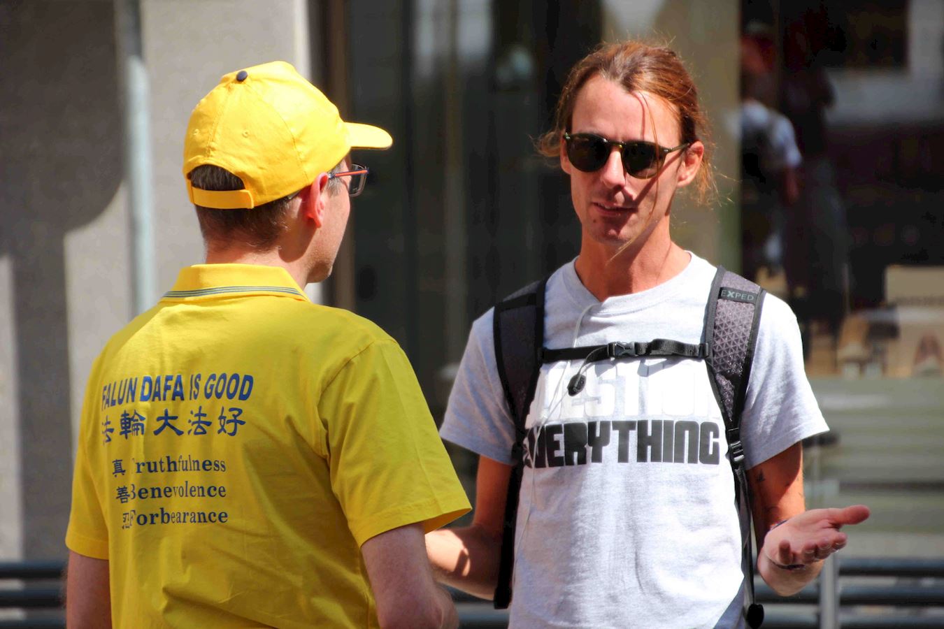 一位带着妈妈出来逛街的演员谈到自己在两三年前就曾在信息摊位上了解过法轮功。他谈到:“违背人们的意愿摘取他们的器官,这不该发生,我觉得太恐怖了。人们的言论自由被限制,人们只是表达一些观点,了解一些事情,但是政府来阻止,这让我觉得太吓人了。我们这简直是奢侈,可以享受这样的自由,可以帮助别人,仅仅是一个签名而已,这要求的可不多。”