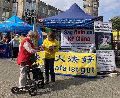 活动当天正好是周六,天气晴朗。当学员们一大早来到步行街大型购物中心阿利中心(Allee-Center)前的广场上时,已经有不少政党在为当天的选举搭建宣传展位了。学员们把鲜明的“法轮大法好”横幅拉起来时,就有不少来自不同政党的成员好奇的前来询问。行人渐渐地多了之后,学员们开始演示功法。许多人了解到中共的迫害后表示震惊,毫不犹豫地为反迫害签名,并向学员道谢。
