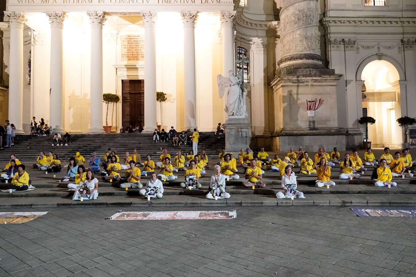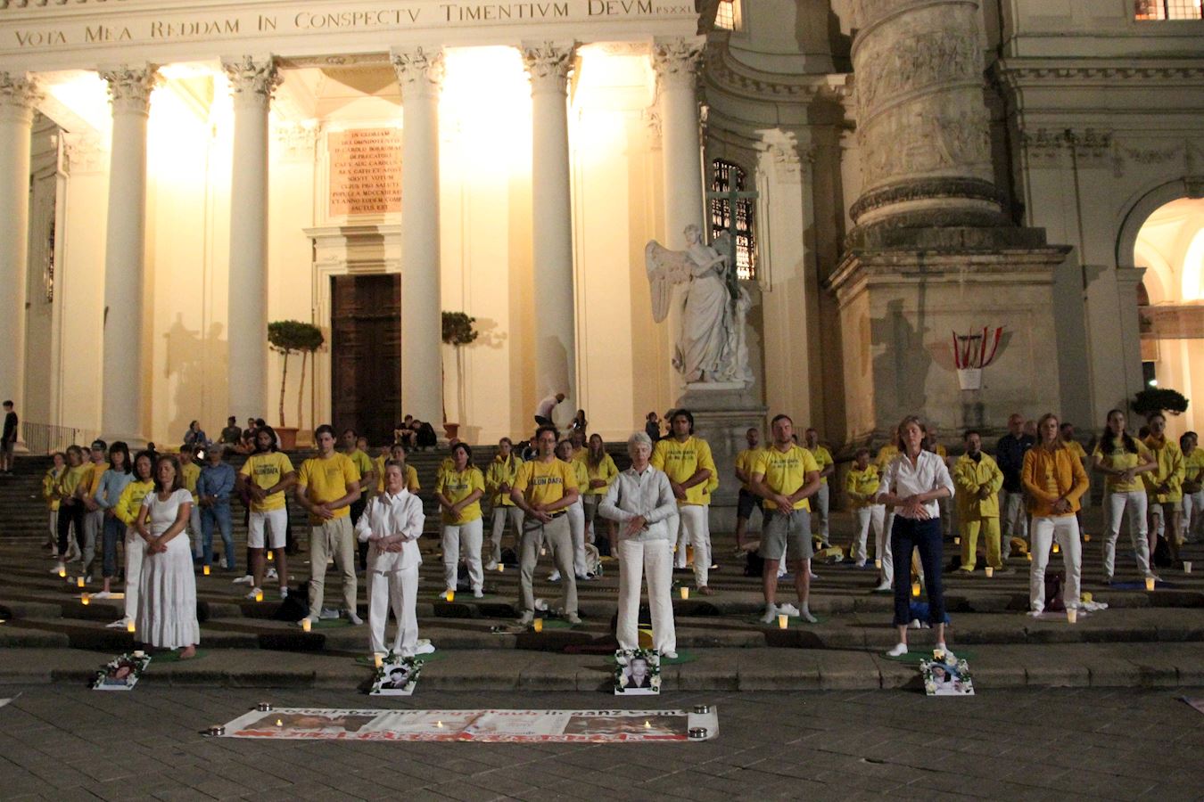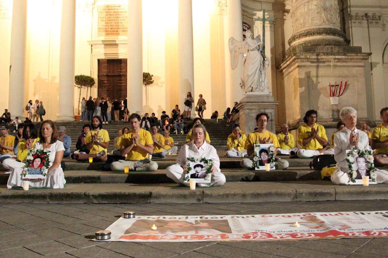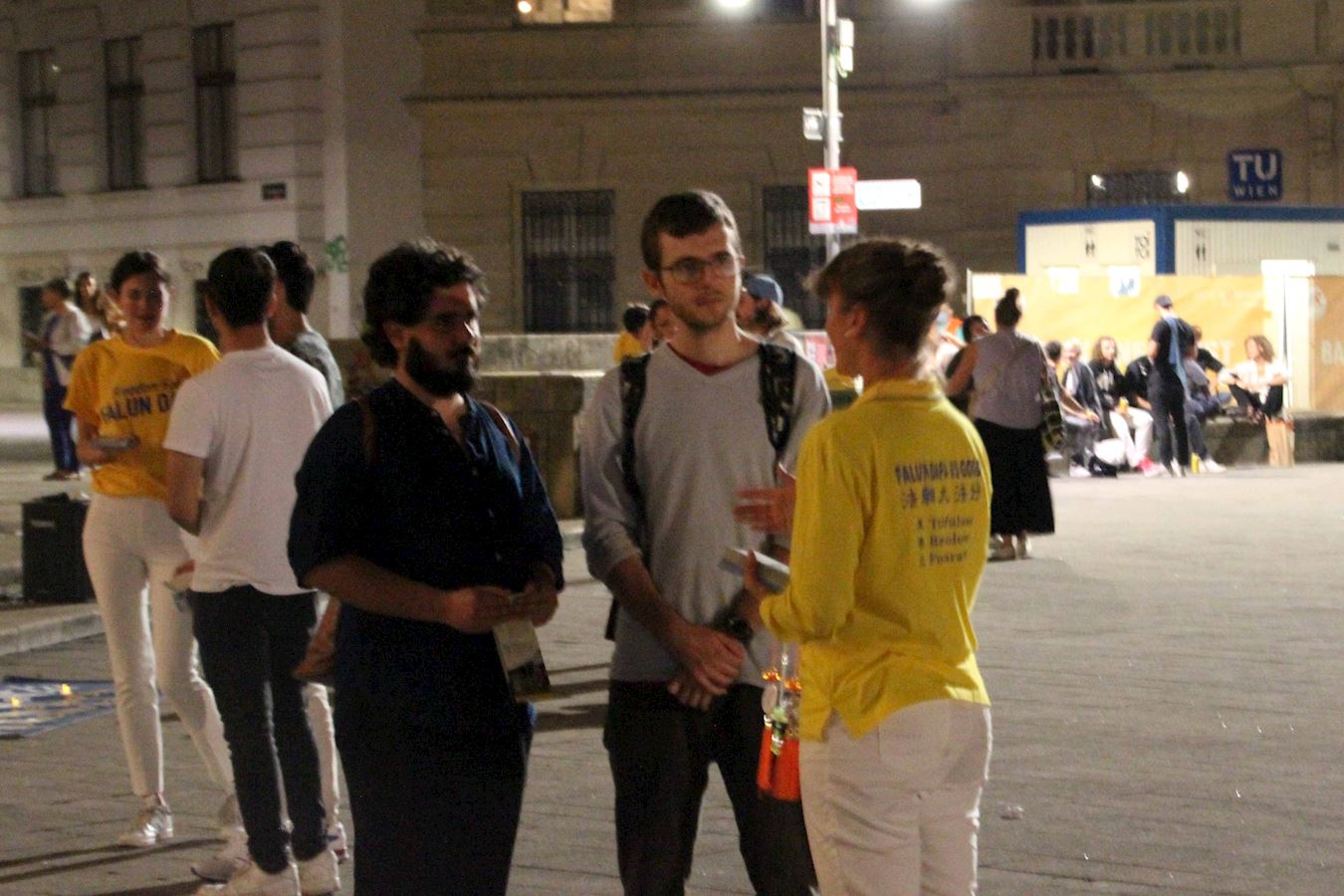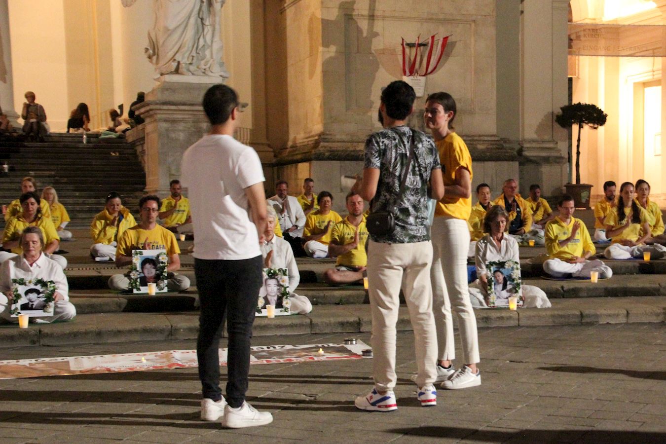 二零二零年九月十二日晚,在奥地利首都维也纳圣卡尔教堂(Karlskirche)前,来自欧洲多个国家的法轮功学员在烛光下肃穆静坐,间或会演示功法,前排摆放着横幅及部份被迫害致死的学员的照片。主持人通过扬声器向民众介绍着法轮功的美好,并揭露中共迫害法轮功学员的罪行。这里通常是年轻人的聚集地,这个周六的夜晚也不例外,有的年轻人静静的听着介绍,有的接过学员递上的真相资料,有的向学员询问更多的讯息。