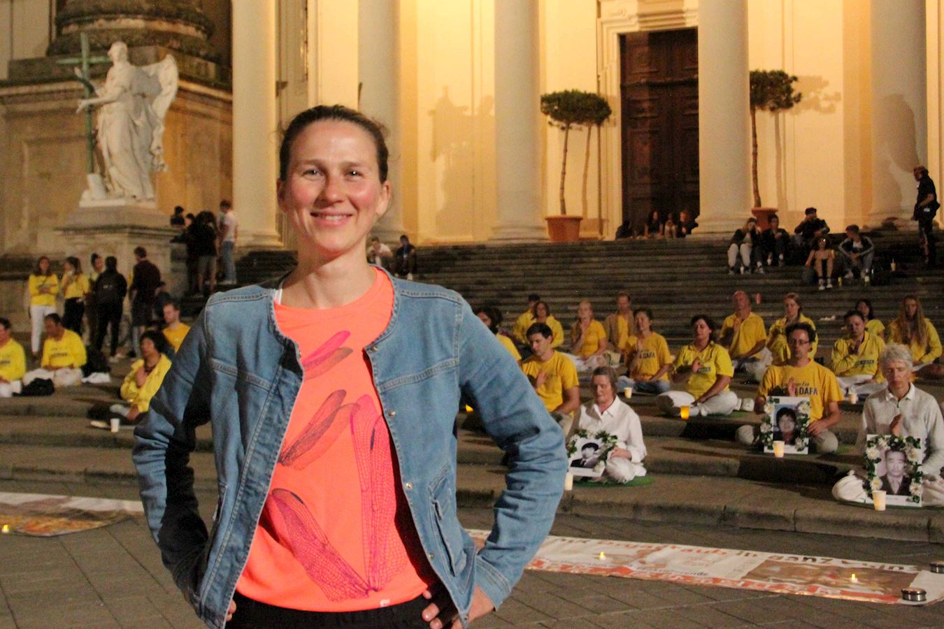“我能做什么来帮助你们?”突然一位坐在轮椅上的年轻女孩大声的问主持人,这位十九岁的奥地利女海斯勒(Alina Haehsler),曾在网上听说过法轮功,又在当晚听到了更多的真相讯息。“当我听到他说正在中国发生的事情时,我很想帮忙。”她在事后解释道,看着那些炼功的法轮功学员她接着说:“(法轮功)非常非常好,真是太棒了。有这么多人(法轮功学员)聚在一起,齐心协力,这让我觉得如此的美好!”