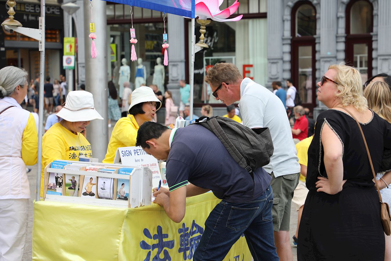 ![]() 图3:阿姆斯特丹市中心,游人在制止中共活摘法轮功学员器官征签表上签字 |