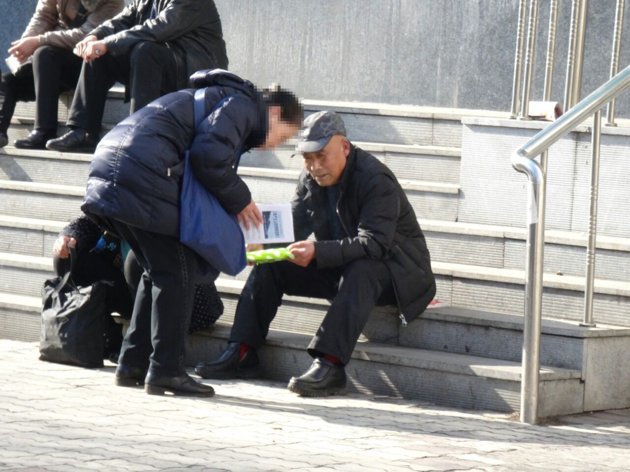 四月初,天气依然很冷,李姐穿着冬天最厚的羽绒服都觉得冷,那天正打着横幅,一辆在横幅前驶过的车突然打开车窗,年轻的女司机戴着口罩冲着李姐喊“法轮大法好”!还有车辆经过那里,特意鸣笛然后向学员竖起大拇指,为她们加油!