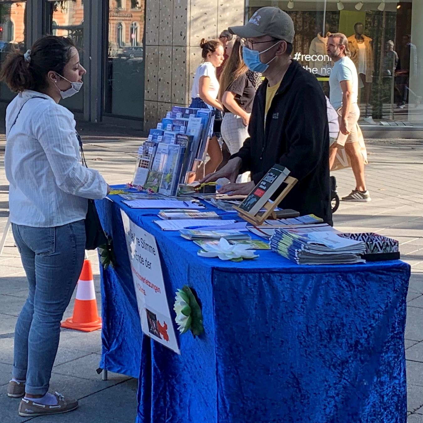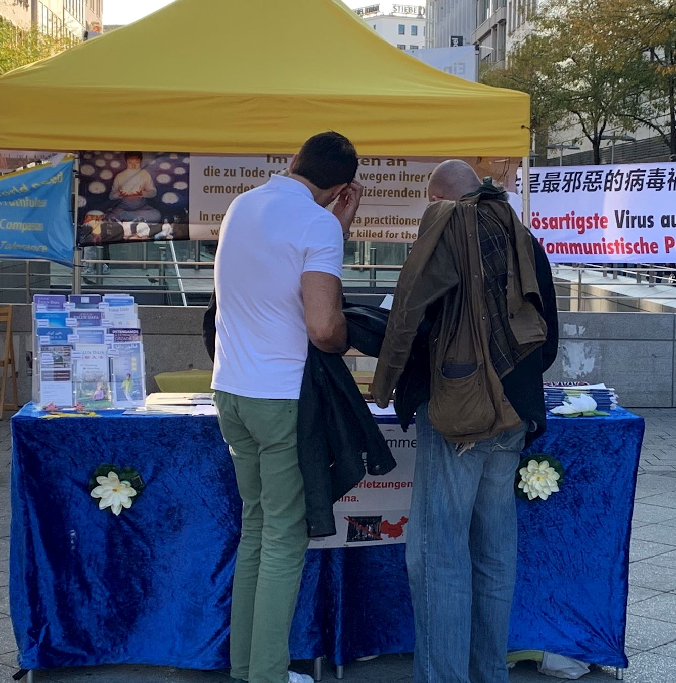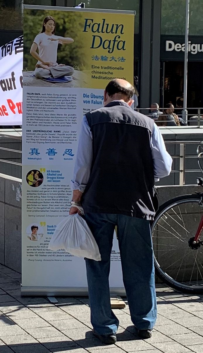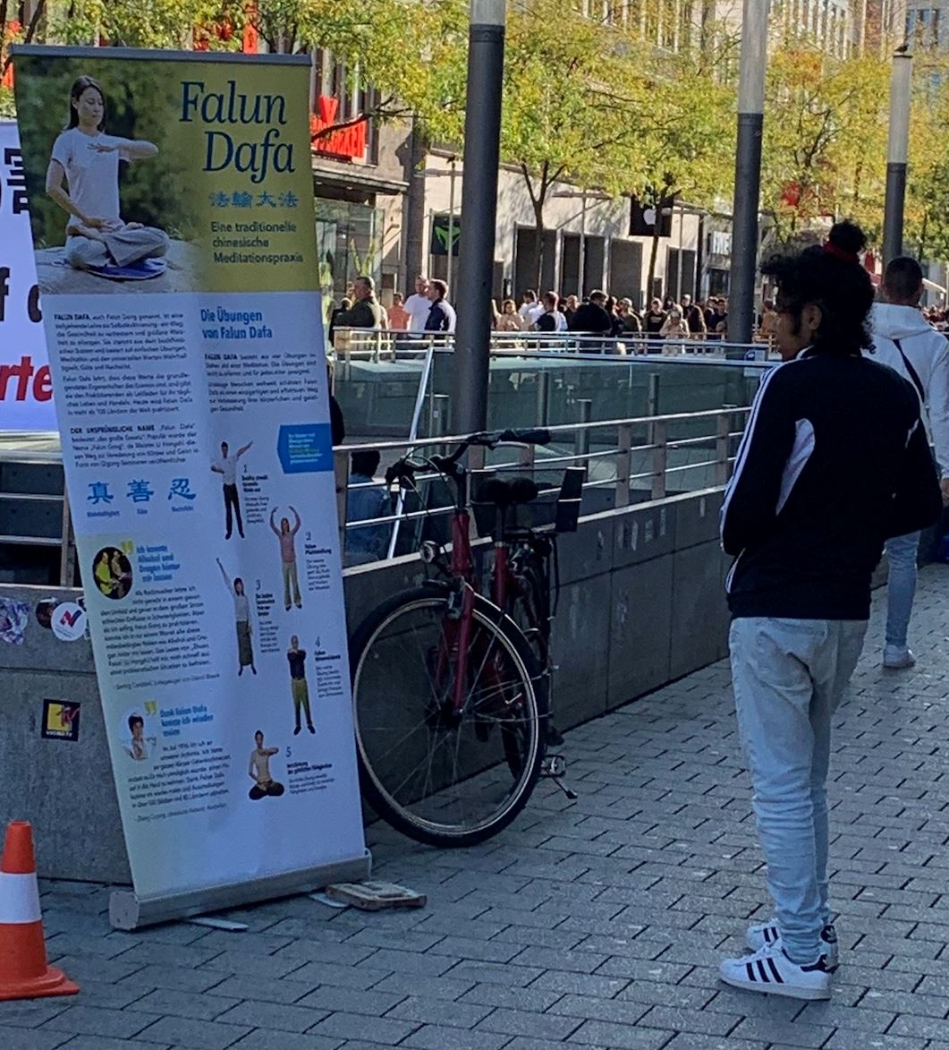 汉诺威近期外国人特别多,有些外籍人来到法轮大法学员举办的信息台前签名并了解相关讯息。在信息展位上摆出了有至少十种语言的传单。一位伊朗人很高兴得到了伊朗语的传单,并对学员表达衷心的感谢。他表示,他想学习法轮大法的五套功法。