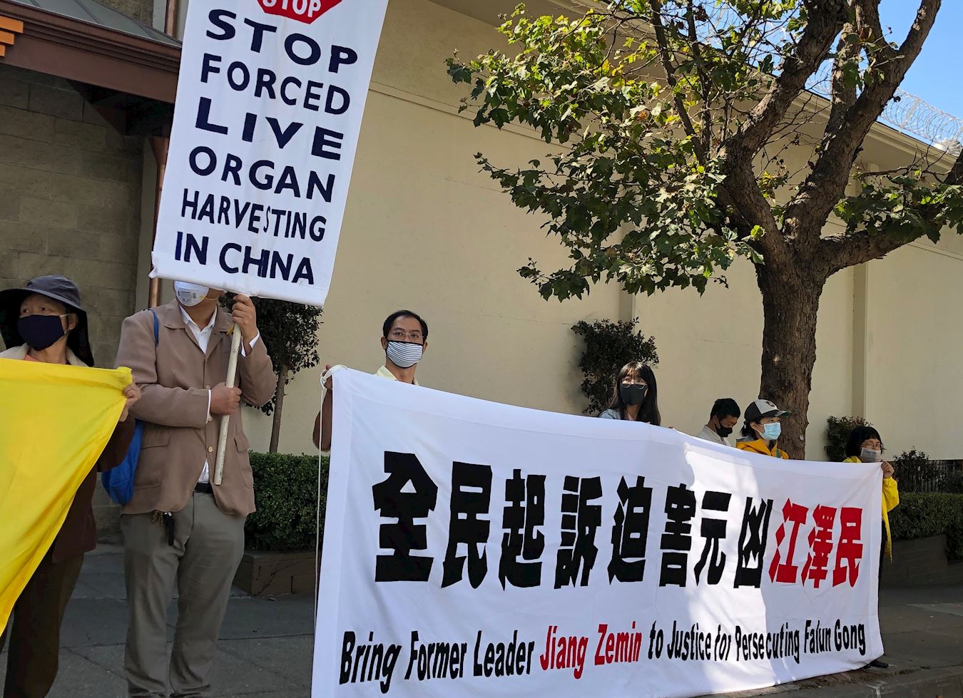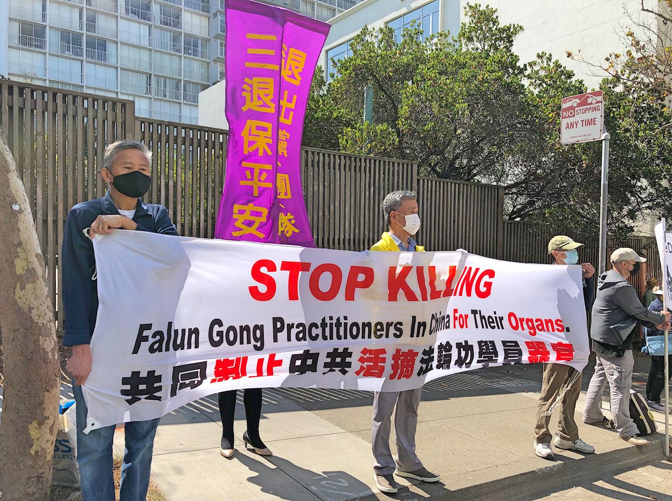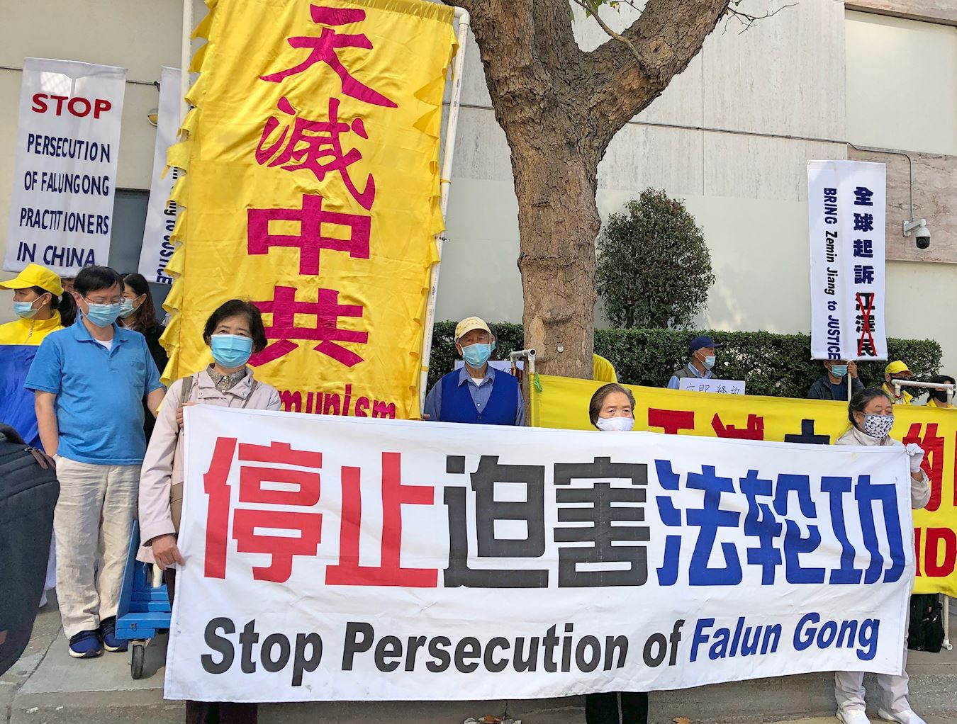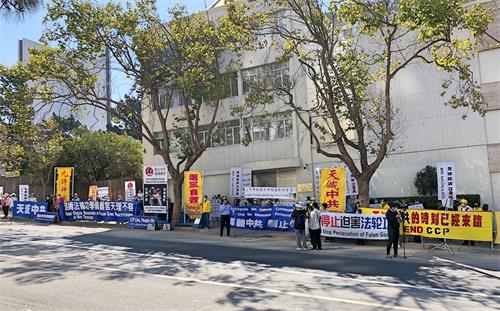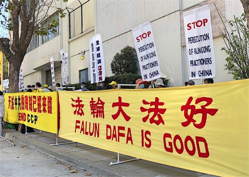 当天上午十一点左右,旧金山湾区的法轮功学员们陆续来到旧金山中领馆前,打出“停止迫害法轮功”,“制止活摘法轮功学员器官”,“法轮大法好”,“世界需要真善忍”,“解体中共 停止迫害”,“法办江泽民”,“天灭中共 三:退.保平安”等横幅。