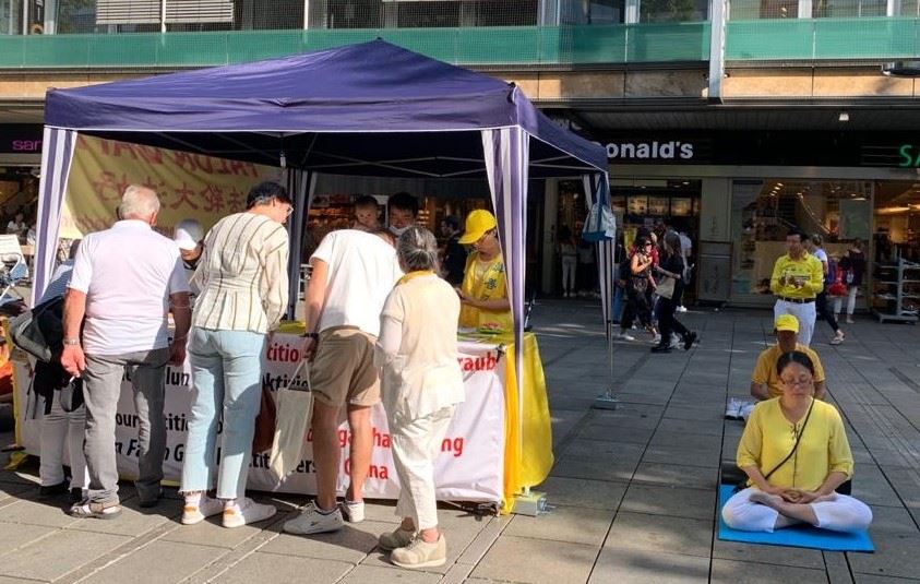 一对德国年轻人路过信息台,小伙子说在公园里见过法轮功学员炼功,自己对法轮功也有一些了解,但实在不明白中共为什么要迫害法轮功。“法轮功参与政治吗?”他不解地问。学员告诉他,法轮功不参与政治,但是中共是个独裁政权,因为炼法轮功的人数非常多,超过了中共党员的人数,中共害怕这么多人都遵循“真善忍”信仰,就发动了对法轮功惨无人道的迫害,并活摘法轮功学员的器官卖钱牟利。一直站在小伙子身边的年轻姑娘听完真相,摇着头叹了口气,在反迫害的签名表上签了名,小伙子也签了名,希望自己的签名能对制止迫害起到一点作用,小伙子还详细询问了炼功点的信息。