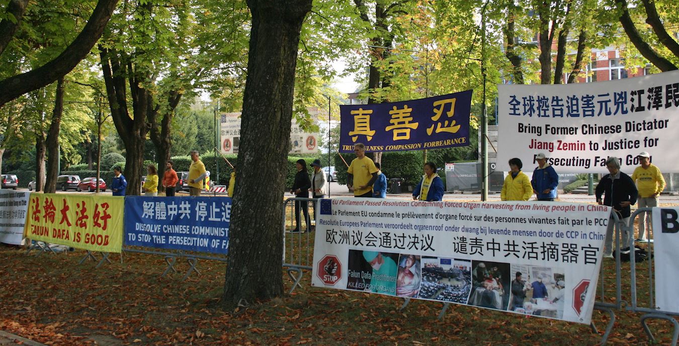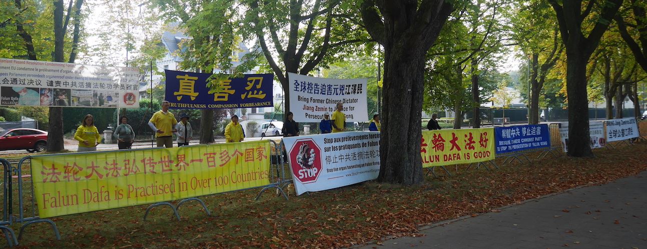 ![]() 图1~3:比利时中使馆前法轮功学员反迫害,中共持续二十一年迫害法轮功,呼吁国际社会共同解体中共、制止迫害、结束暴政。 |
