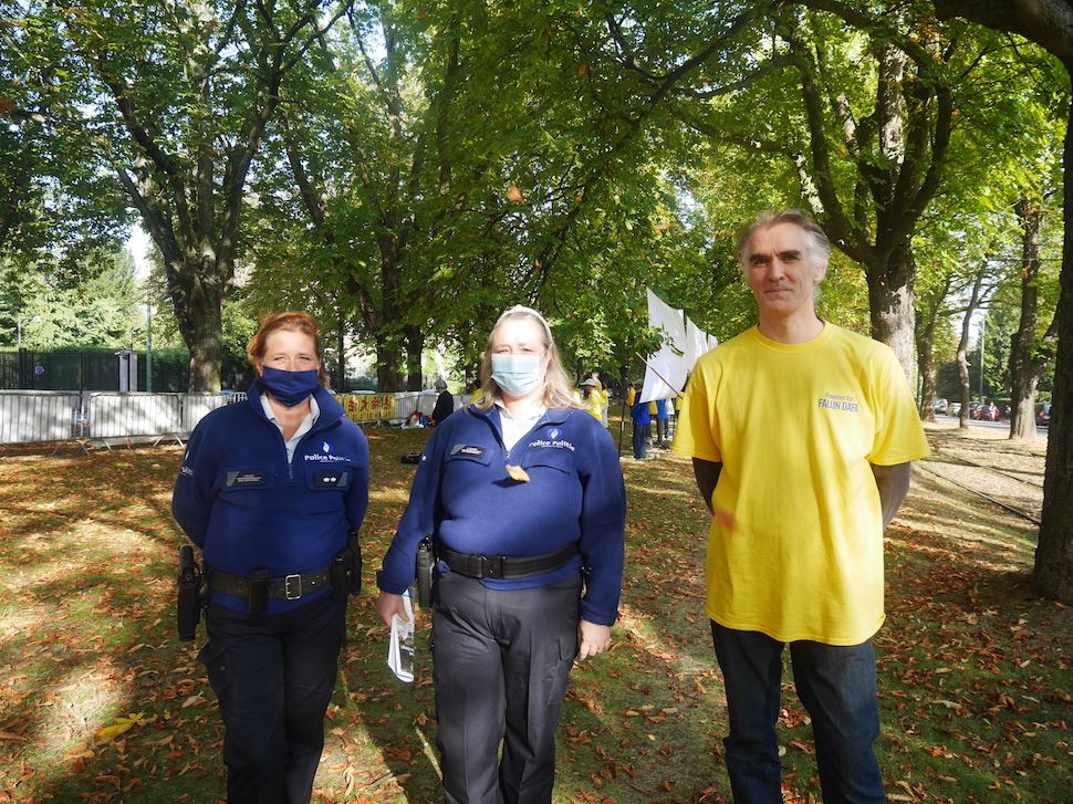 两位公差路过此地的女警察西尔维与伊莎贝尔(Sylvie & Isabelleur),希望更多了解法轮功到底发生了什么事情,要在中使馆前通过展示法轮功功法抗议迫害。学员尼克向她们详细的介绍了法轮功由最初在中国受到人民广泛欢迎,到被中共打压迫害;更犯有活摘器官牟利的罪恶行径。