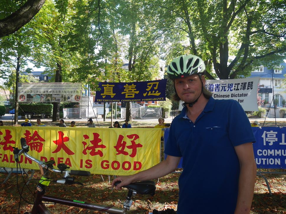 青年盖尔特(Geert)停下自行车,观看横幅内容,他知道中共很邪恶。他询问法轮功学员,你还能够回中国吗?当得到否定答复后,他说:“中共就是利用经济钳制国际社会,你们很勇敢,我要上网查看法轮大法情况,我支持你们反迫害,祝你们好运。”