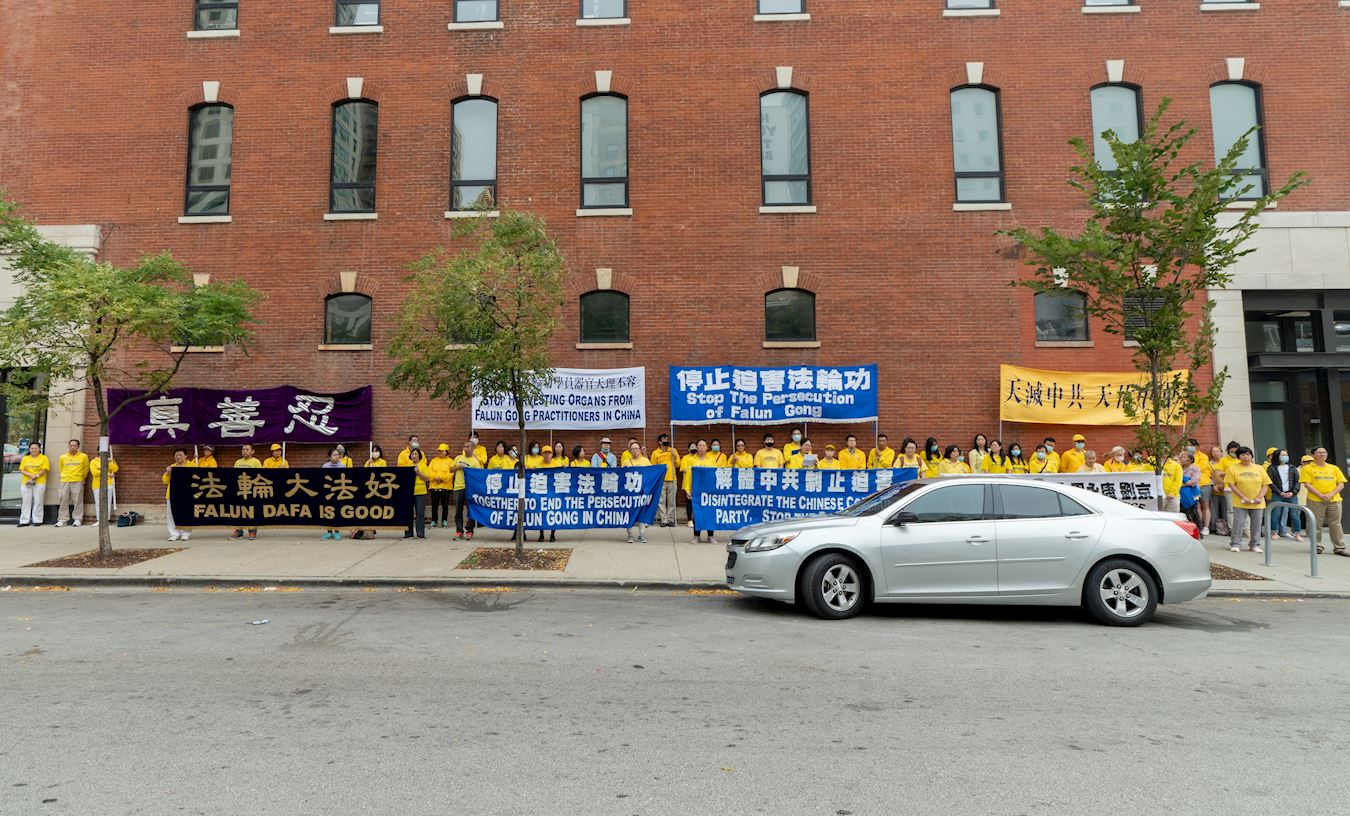 当天下午,法轮功学员们来到芝加哥中领馆前,打出“停止迫害法轮功”,“中共活摘法轮功学员器官天理不容”,“法轮大法好”,“真、善、忍”,“解体中共制止迫害”,“法办江泽民”,“天灭中共,天佑中华”等横幅。