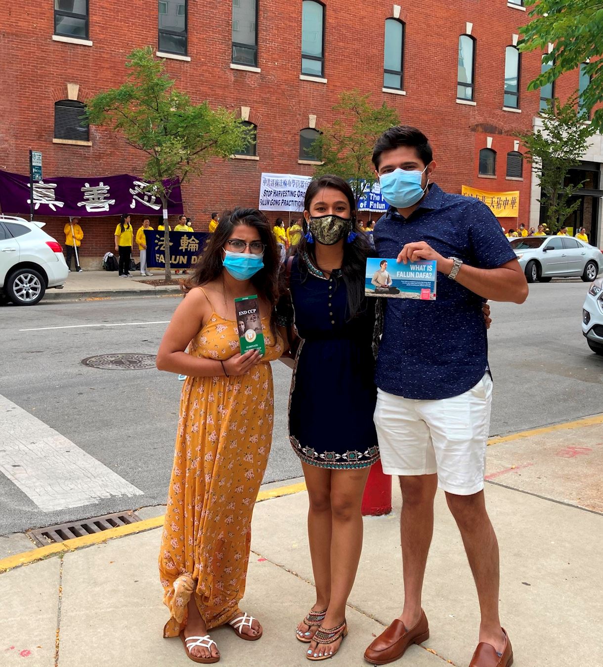 住在芝加哥的印度族裔年轻人Birju,Chandani和Sarah非常高兴了解到法轮功是佛家修炼大法,他们对佛家修炼并不陌生。他们在活动场地前留影,对法轮功学员反迫害表示支持。
