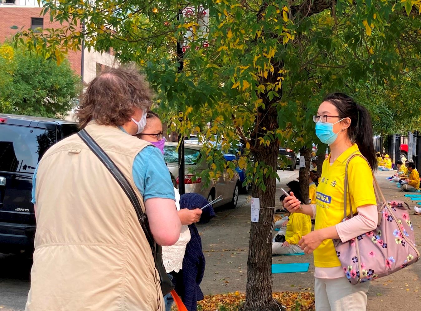 芝加哥居民Peter和 Carolina在神韵演出中听说过法轮功,今天亲眼看到法轮功学员平静祥和的炼功场面,他们无法相信这么好的功法在中国竟被打压迫害,非常同情法轮功。他们拿取了资料,希望进一步了解详情。