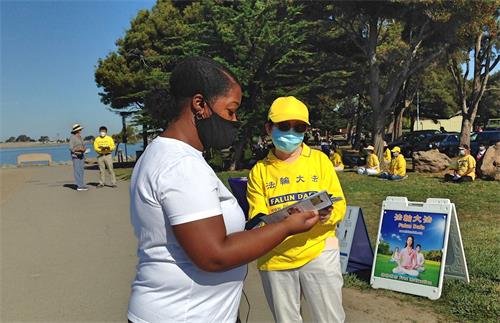 一位白人女士在久久观看学员炼功后,也走上前来了解真相。听完学员的介绍后,她说:“现代社会就需要像法轮功这么祥和的功法。”学员给她介绍,这么祥和的功法,在中国大陆却是不被允许的 。她对此感到很震惊。但当听到是中共在迫害法轮功时,她一下子就明白了为什么。她并询问了多个关于炼功的具体问题,如需要多少时间炼完五套功法等。最后,她要了炼功点的具体信息,并表示下周末要到炼功点学功。