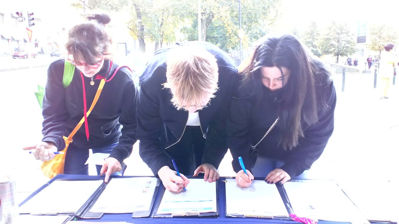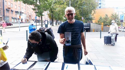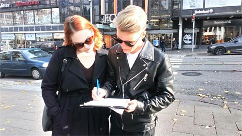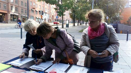 琳达(Linda)和两位老太太是虔诚的基督教徒。她们走到桌子前表示要签名。其中一人说:“只要是中共迫害人权的事情,我都会签。”她们与学员分享最近芬兰媒体上报道几篇关于揭示中共迫害人权的文章,并表示说:“中共的极权统治会被清算。”临走时对学员肯定的说:“神会保佑你们,迫害一定要停止。”