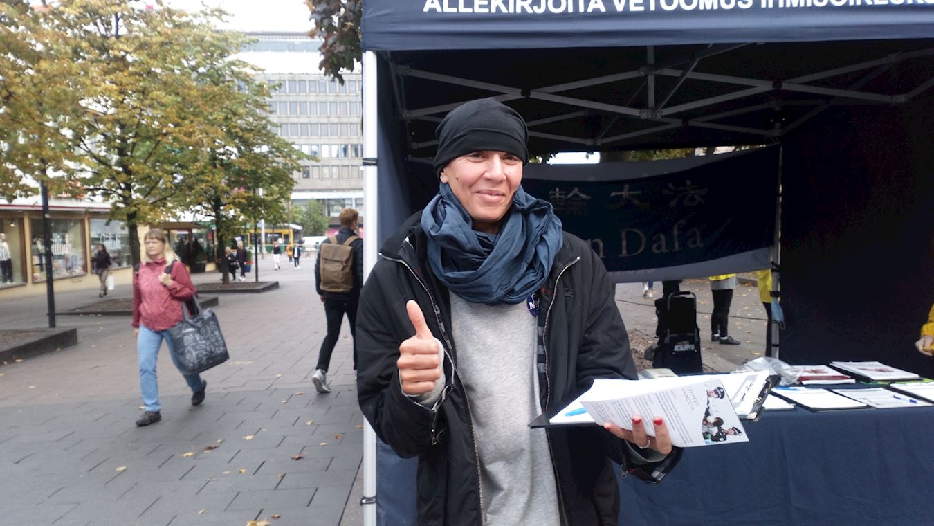 巴瑞卡(Parika)是一位来自爱沙尼亚的女士。她感慨地说:“你们站在这里发声是非常重要的事情。迫害一定要停止。这不是一般的迫害,而是种族灭绝。神会保佑你们,迫害一定会很快结束。”她还说:“我会回去阅读更多法轮功的信息。之前也听说过法轮功,但是没有想到迫害这么严重。”临走时,她双手合十,表示对学员的感谢。
