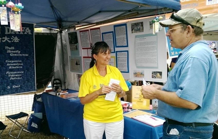 ![]() 图2:梅耶在地方节庆活动中设立了法轮功摊位,向当地民众介绍大法美好。 |